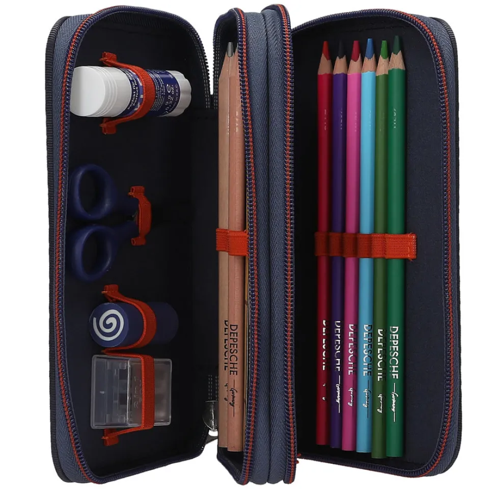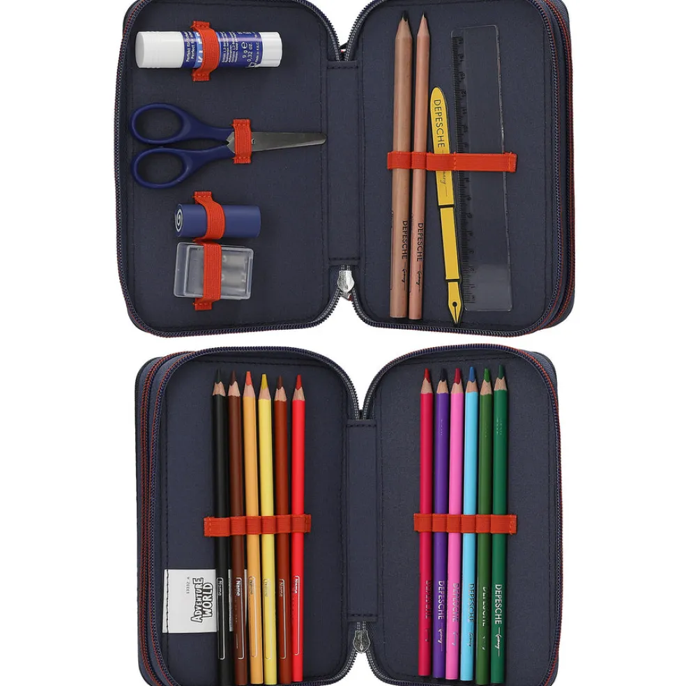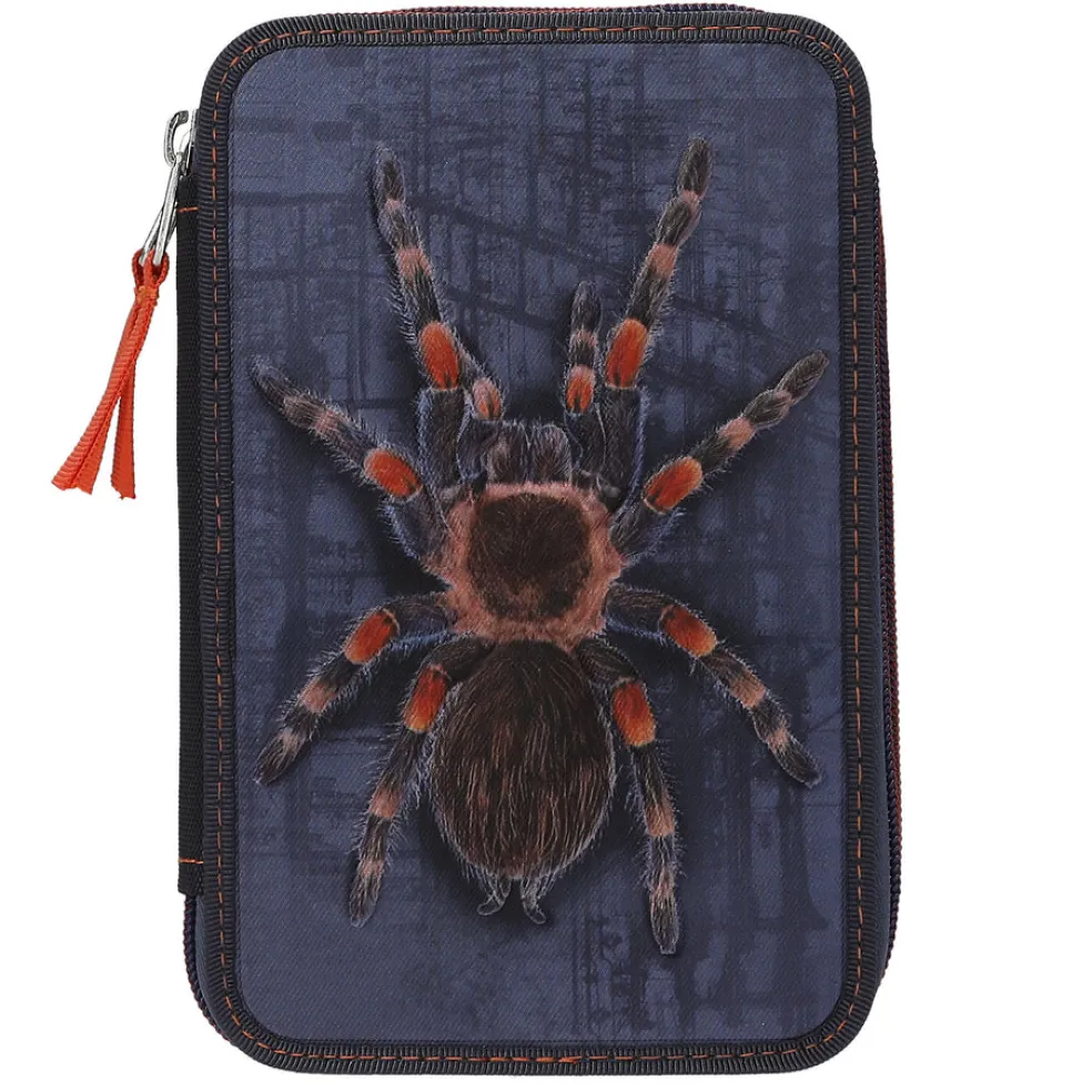 Tummansinisen Adventure World -tuplapenaalin kannessa on upea 3D-tarantella. Kaksi vetoketjulla sulkeutuvaa osiosta sisältävät 12 puuvärikynää, lyijykynän, teroittimen, pyyhekumin, teroittimen, sakset ja liimapuikon. Ei alle 3-vuotiaille. Pieniä osia, tukehtumisvaara.