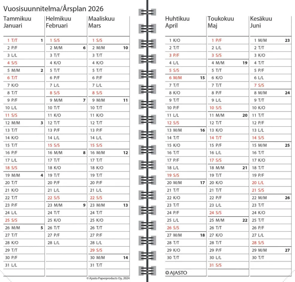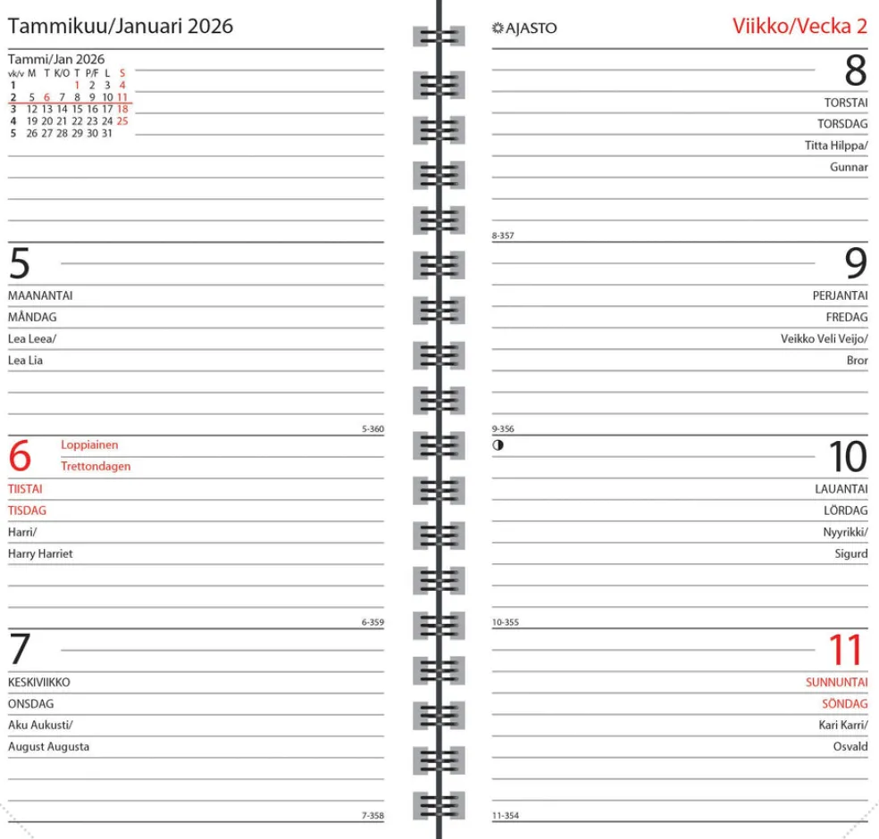 Koko 85 x 162 mm; leatherette-kannet; parikierresidottu; kielisyys: suomi, ruotsi; aukeamalla vaakaviikko; päiväkirja 52/2025 – 53/2026; vuosisuunnitelmat 2026 ja 2027; kansalliset vapaapäivät luettelona; suomalaiset ja suomenruotsalaiset nimipäivät; muistiinpanosivuja; Euroopan kartta; kynänpidike; Avainlippu-tuote; FSC®-sertifioitu tuote.