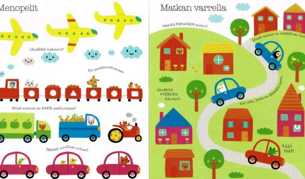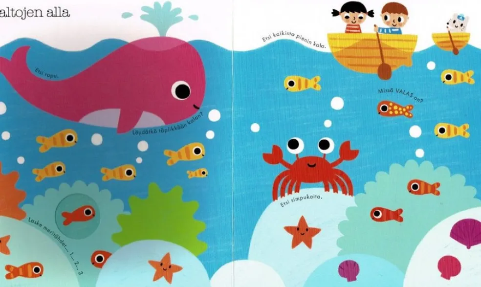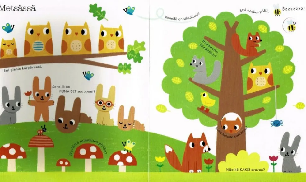 Onko kissalla huivi vai raitoja hännässä? Löydätkö robotin, jonka vatsaa komistaa kello? Yhdessä ihmettelemällä ja keskustelemalla vastaukset näihinkin kysymyksiin kyllä löytyvät. Valmiiden kysymysten lisäksi katselukirja tulvii värejä, muotoja sekä hauskoja hahmoja äkättäväksi ja tökättäväksi. Kuvituksissa kuljetaan läpi monipuolisten ympäristöjen kotiovelta kosmoksemme kaukaisimpiin kolkkiin saakka. Erilaiset aukeamat ja teemat yhdistyvät toisiinsa kurkistuskoloilla, joiden takaa seuraavien sivujen hahmot jo vilahtelevat.