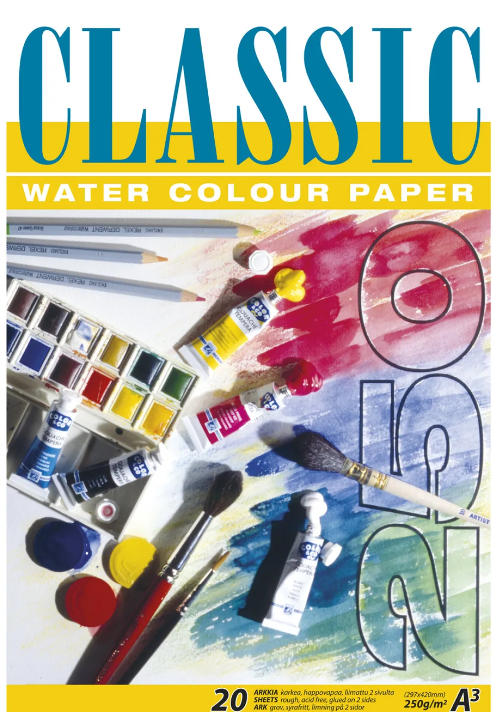 Classic- akvarellilehtiö sisältää 20 arkkia luonnonvalkoista, happovapaata paperia. Paperi on liimattu kahdelta sivulta. Lehtiön koko: A3, Arkkeja: 20, Vahvuus: 250 g/m², Väri: luonnonvalkoinen