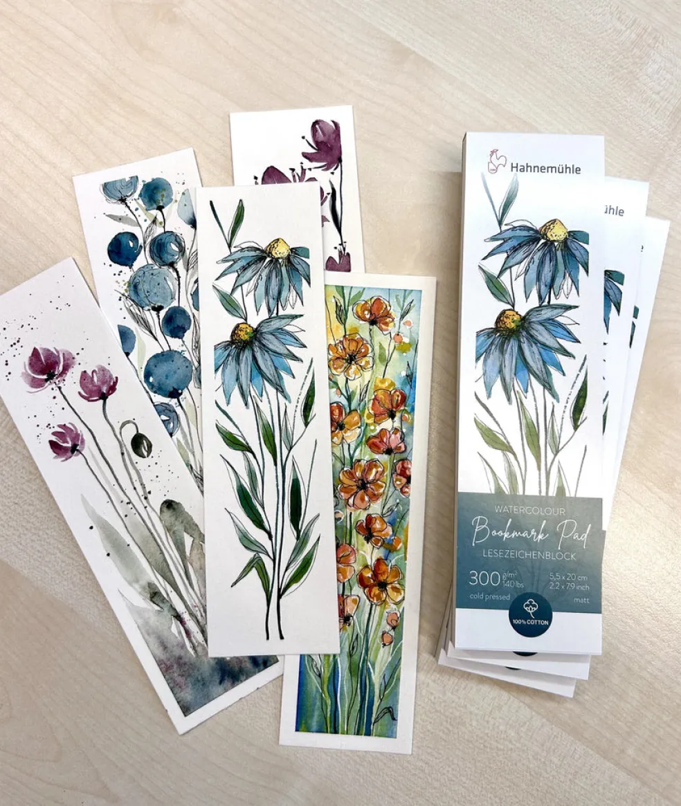 Hahnemühlen kirjanmerkkilehtiö on täydellinen tuote kirjoja rakastavalle, luovalle ihmiselle! Luo kauniisti muotoiltuja kirjanmerkkejä ja saat hymyn huulillesi tai yllätä rakkaasi hyvin henkilökohtaisella lahjalla. Hahnemühle Watercolour Bookmark Pad sisältää 15 valmiiksi leikattua kirjanmerkkiä, joten voit aloittaa heti! Tukeva 100 % puuvillapaperi 300 gsm soveltuu hyvin akvarelliväreille, tusseille, kynille, sekä guassi- ja akryyliväreille. Kirjanmerkkien koko on 5.5 cm x 20 cm ja viuhkassa on 15 kappaletta niitä. Paksu puolikarkea akvarellipaperi imee hyvin värin ja veden, ja värejä voi kerrostaa sille huoletta. Kirjanmerkkilehtiössä on valmiiksi leikatut kirjanmerkkiarkit kenelle tahansa luovalle ihmiselle. Laadukas, paksu paperi ei repeä merkkejä irroittaessasi. Käytä joko pysty- tai vaakasuorassa haluamasi merkin luodaksesi. Kokeile maalata kukkia tai maisemaa vaakasuoraan, ja esimerkiksi eläimiä, valaita tai muita luovia ideoita pystysuoraan!