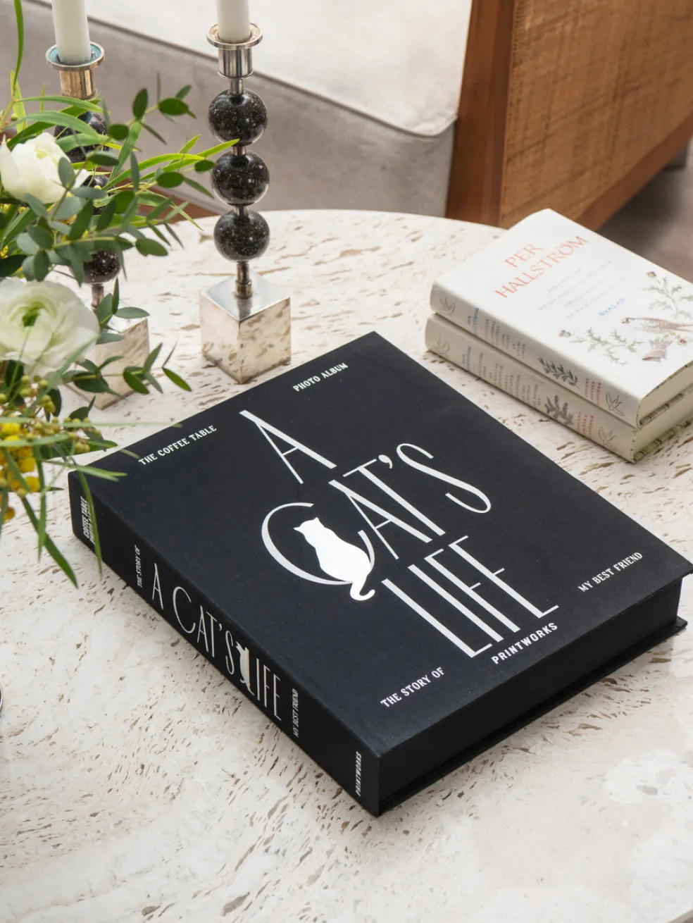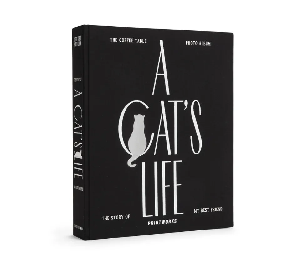 Kissa -albumissa on kaunis musta kangaskansi valkoisella tekstillä. Sisältä löydät 30 sivua korkealaatuista valkoista valokuvapaperia, johon voit helposti kiinnittää valokuviasi. Jokaiselle sivulle mahtuu kaksi 10×15 cm:n valokuvaa, ja niiden alla on tilaa henkilökohtaisille muistiinpanoille. Valokuvapaperin koko on 28×21 cm.