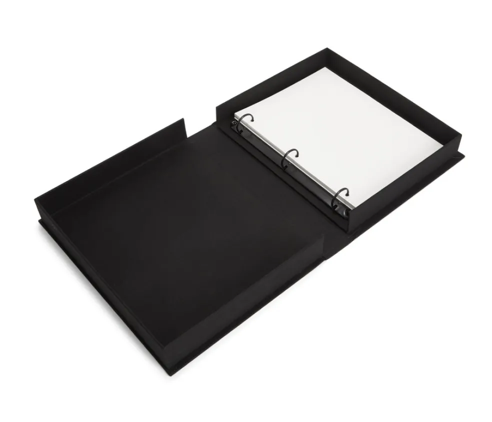 - Sisältö Material: Cover: 100% Cotton fabric + recycled greyboard. Pages FSC, acid free black card. Black metal binder.