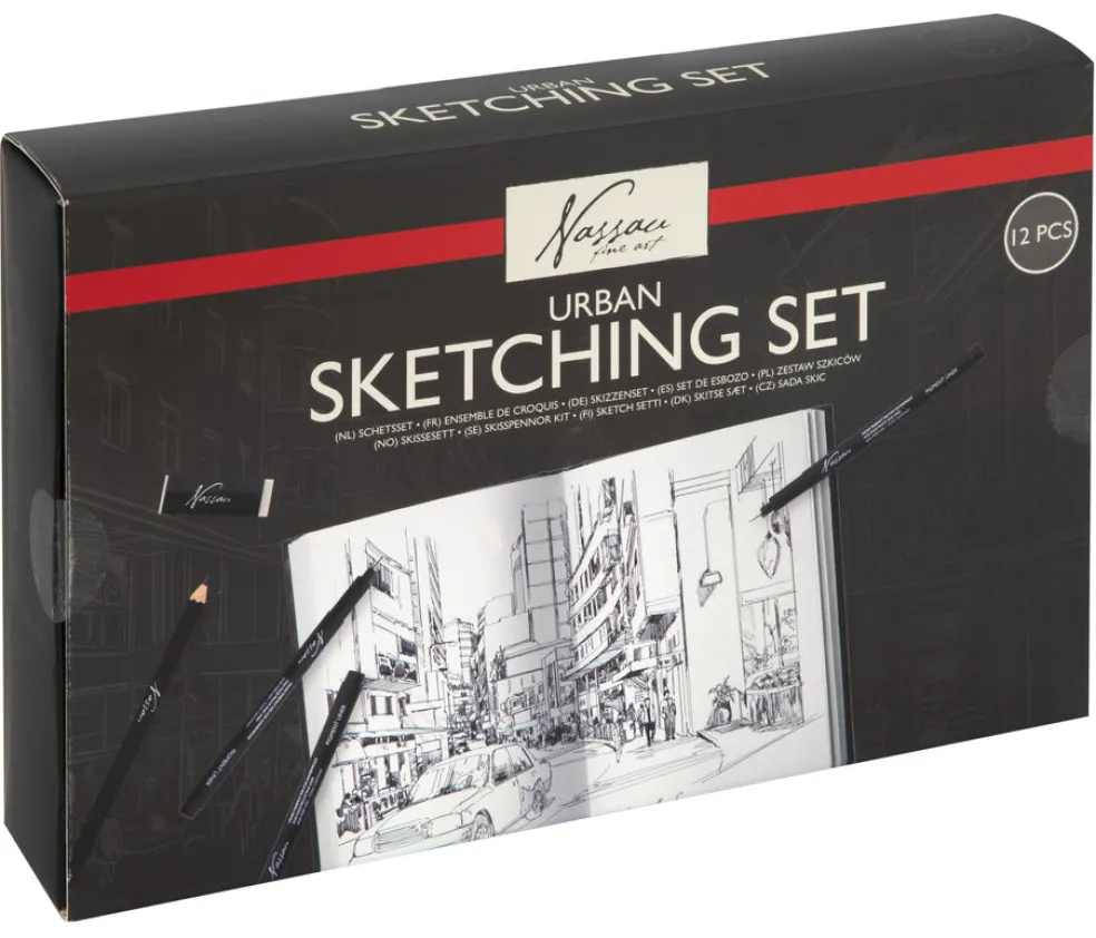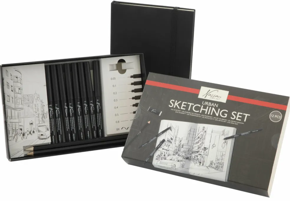 Tutustu Urban Sketching -settiimme! Pakkaus sisältää 7 eri leveyksistä fineliner-kynää, sivellinkärkisen tussin , lyijykynät HB ja 2H, pyyhekumin ja 14×21,5 cm kokoisen luonnoskirjan. Luo kaupunkitaidetta monipuolisilla välineillä!