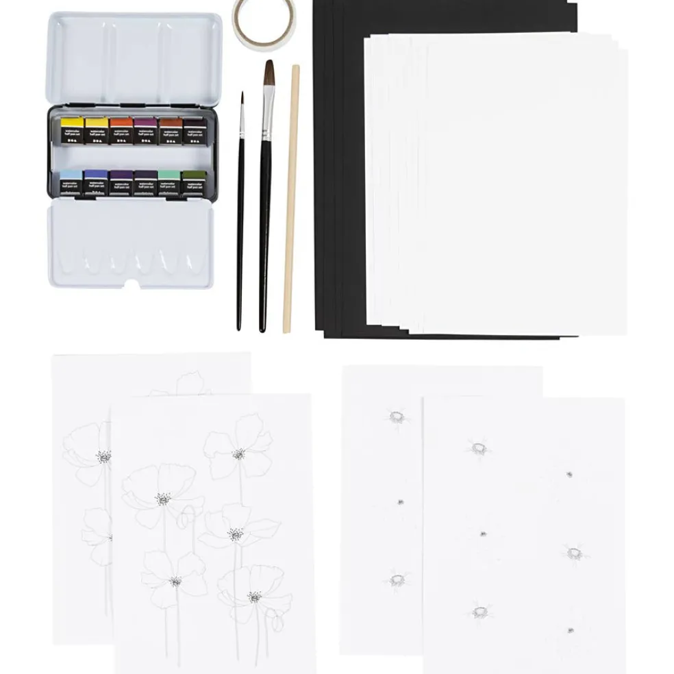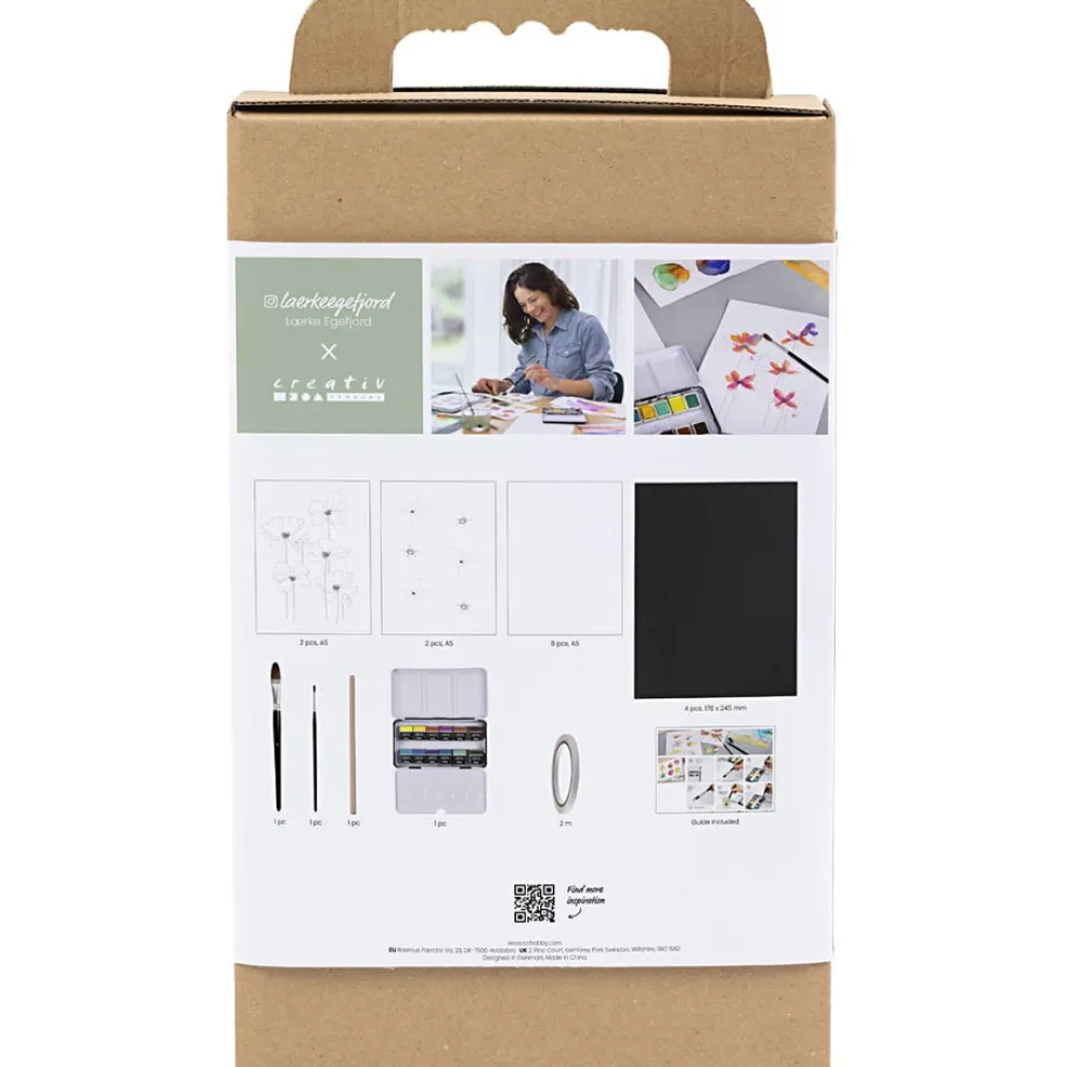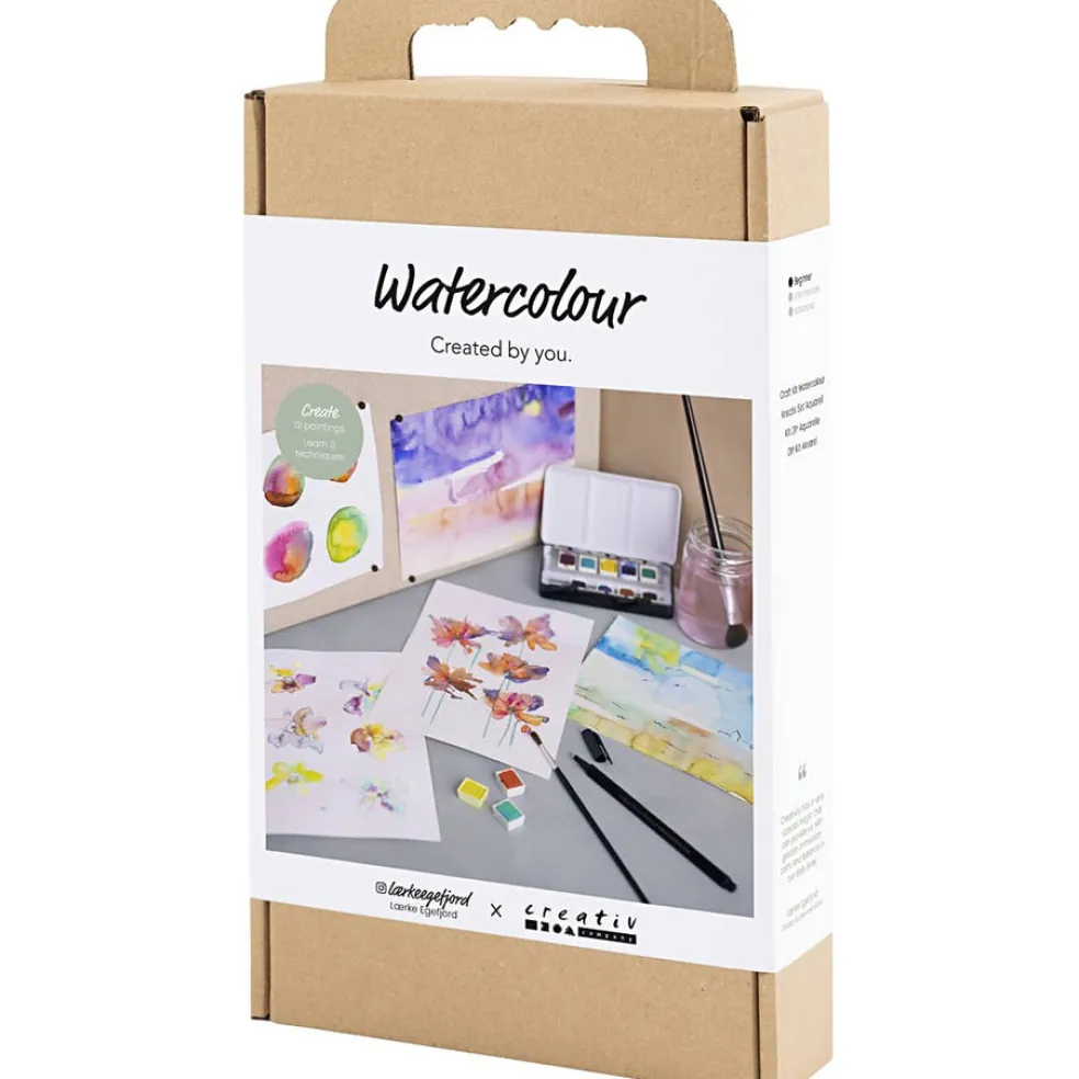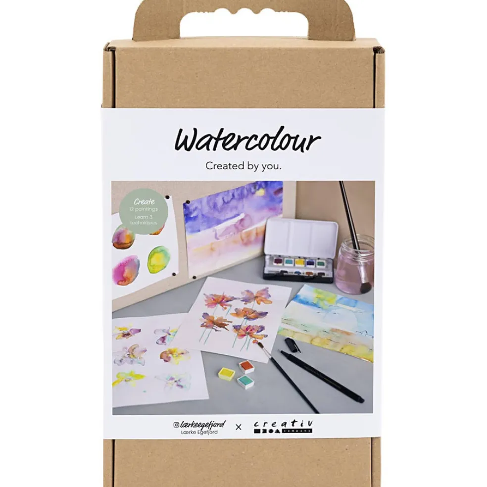 Creativity in a Box -pakkauksella voit kokea vesivärimaalauksen ilon ja rauhan. Luotu yhteistyössä Lærke Egefjordin kanssa. Hän on lääkäri, kirjailija ja taiteilija. Setti sisältää kaikki tarvittavat materiaalit ja ohjeet. Vesivärit sopivat täydellisesti rauhallisiin ja mukaansatempaaviin hetkiin. Tutustu jännittävään maalausprosessiin Creativity in a Box -tuotteilla. Opastamme eri väritystekniikoissa, joita voit kokeilla näyttäviin aiheisiin. Maalaa kauniita kukkia tai rauhallisia maisemia ja koe, miten värit sulautuvat yhteen ja luovat uusia sävyjä ja harmonioita. Se tuntuu taianomaiselta – ja luot kotiisi pieniä mestariteoksia..
