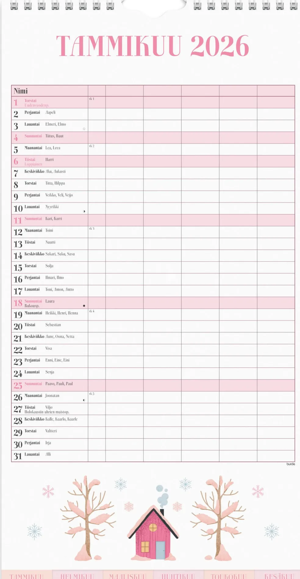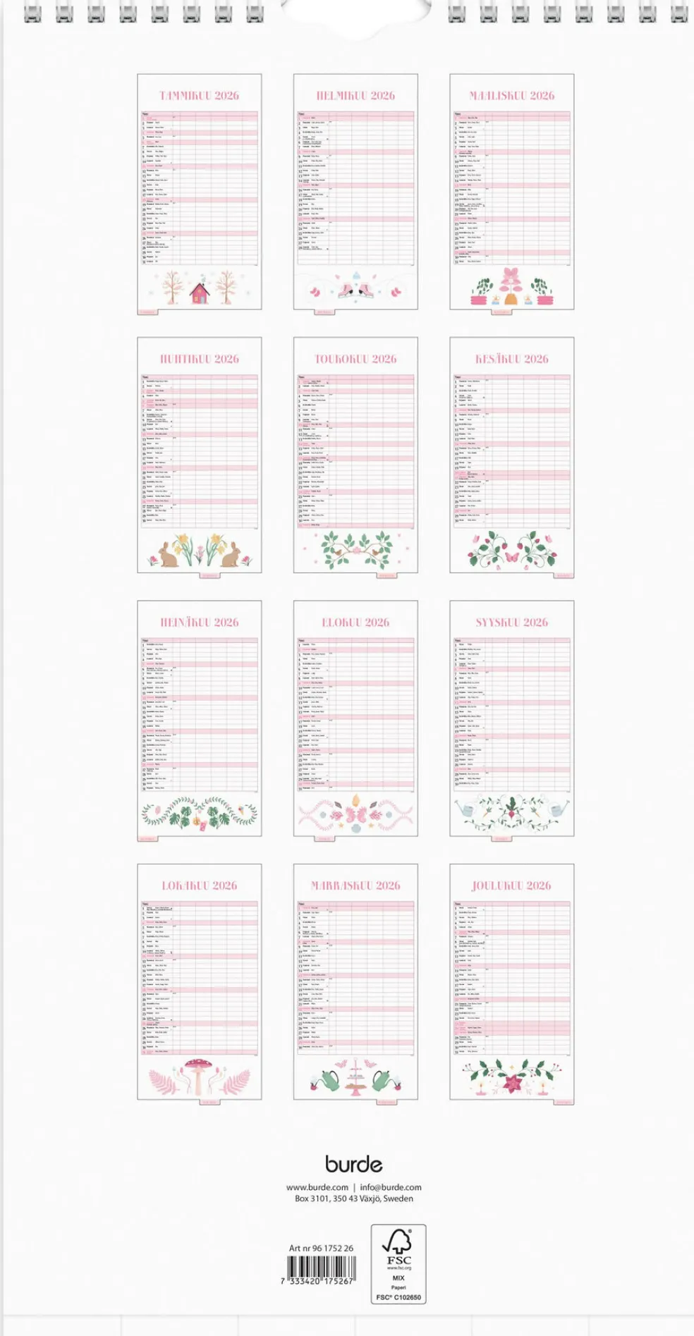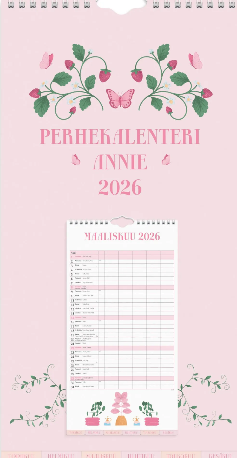 12 sivua. Seinäkalenteri, jokaisella aukeamalla yksi kuukausi ja viisi sarakketta. Kalenteri sisältää suloisia kuvituksia, nimipäivät, liputuspäivät, juhlapyhät ja kuun vaiheet. Suomenkielinen. Parikierresidottu. FSC®. Koko: 220×430 mm.