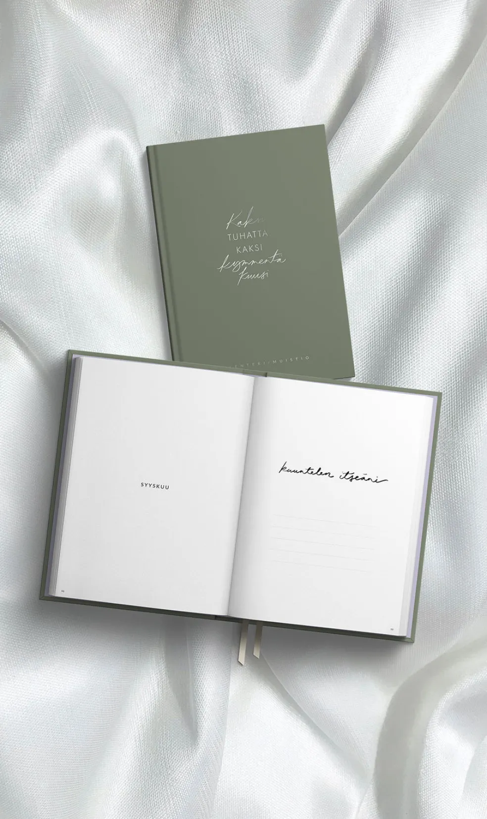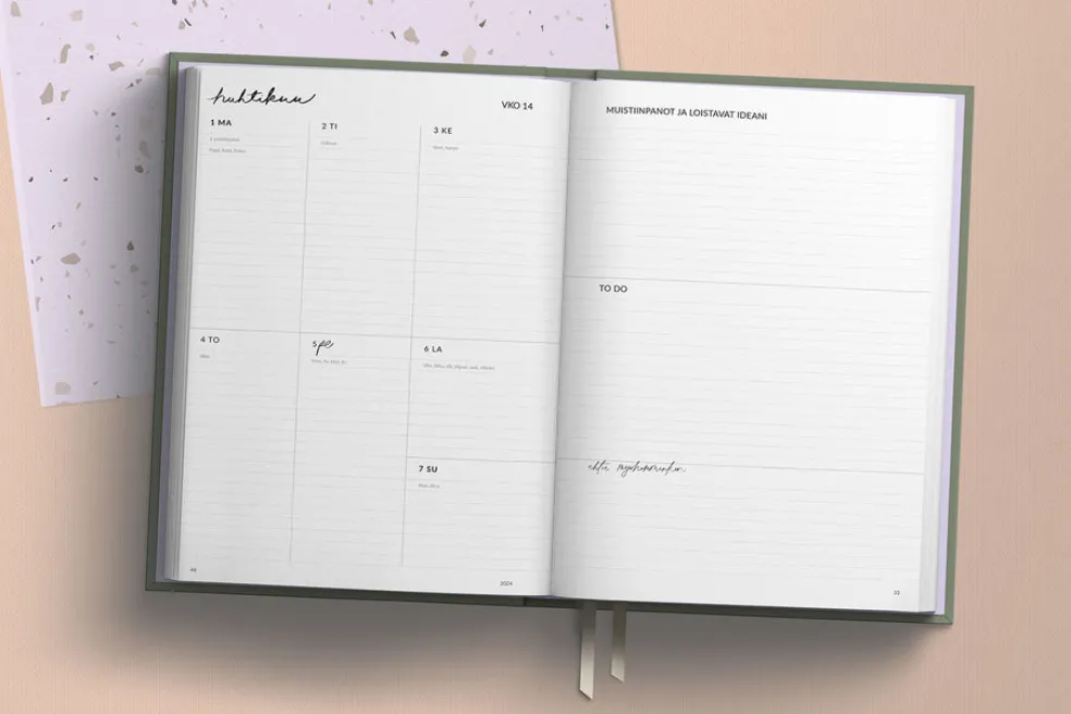 Vuosikalenterin varsinaiset viikkonäkymät alkavat tammikuusta 2026. Ilmavien viikkonäkymien rinnalla on runsaasti tilaa omille muistiinpanoille to do -listoista ja loistavista ideoista niihin asioihin, jotka ehtii myöhemminkin. Kansivärinä kalenterissa vuonna 2026 on salvianvihreä ja kannen vuosilukukalligrafia on hopeafolioitu.