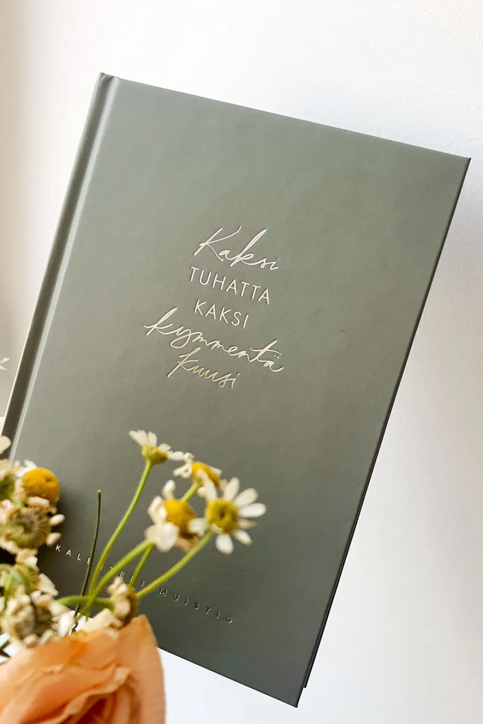 Kannessa hopeafolioitu vuosilukukalligrafia sekä teksti kalenterimuistio