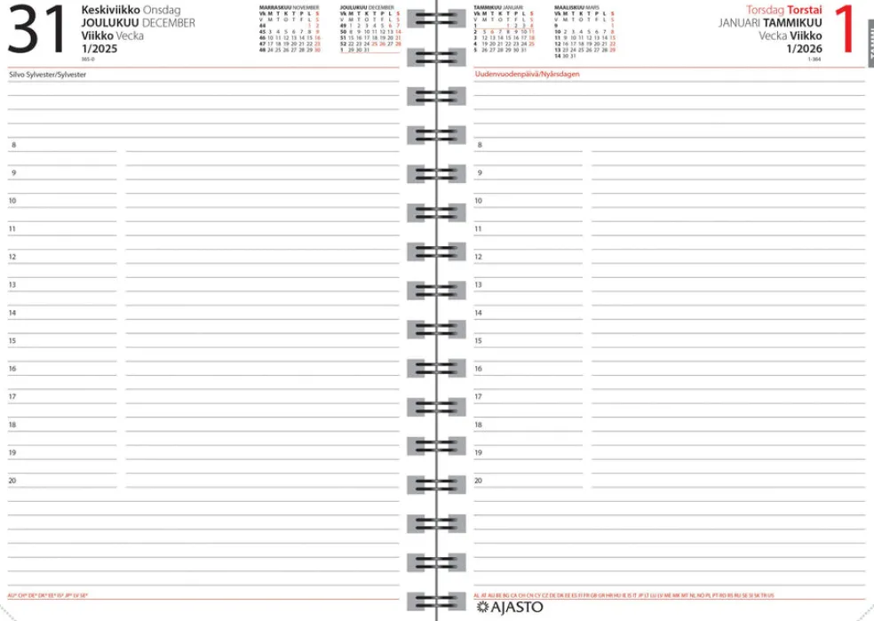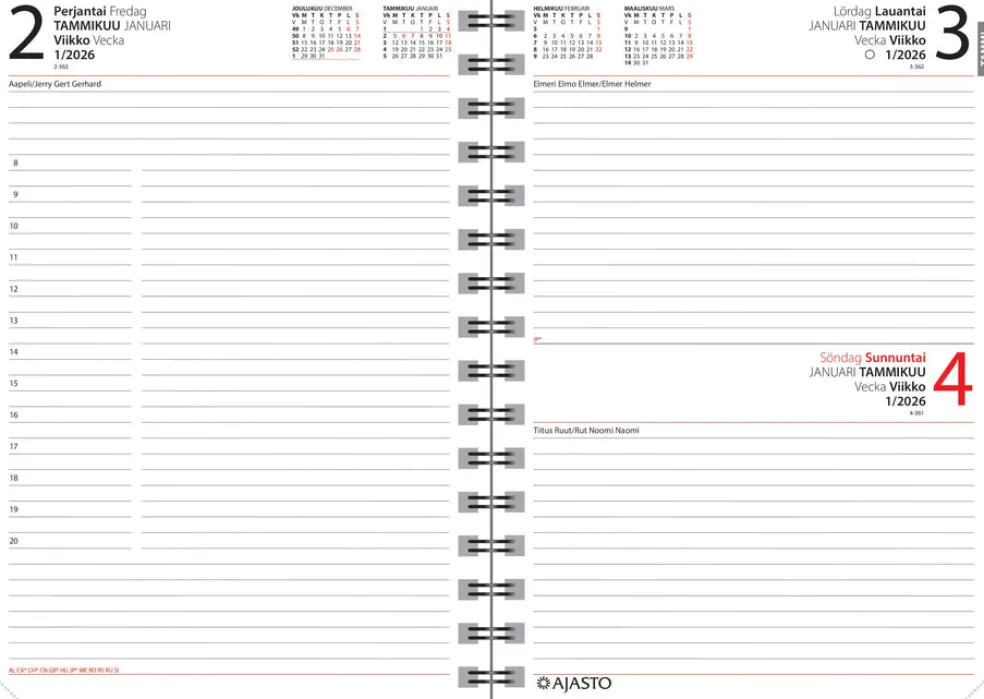 Koko 148 x 210 mm (A5); parikierresidottu; kielisyys: suomi, ruotsi; sivulla päivänäkymä; päiväkirja 52/2025 – 53/2026; vuosisuunnitelmat 2026 ja 2027; kansalliset vapaapäivät; suomalaiset ja suomenruotsalaiset nimipäivät; välimatkataulukko; muistiinpanosivuja; FSC®-sertifioitu tuote.