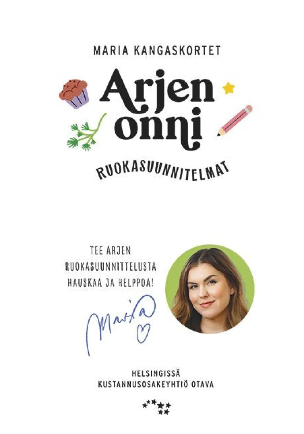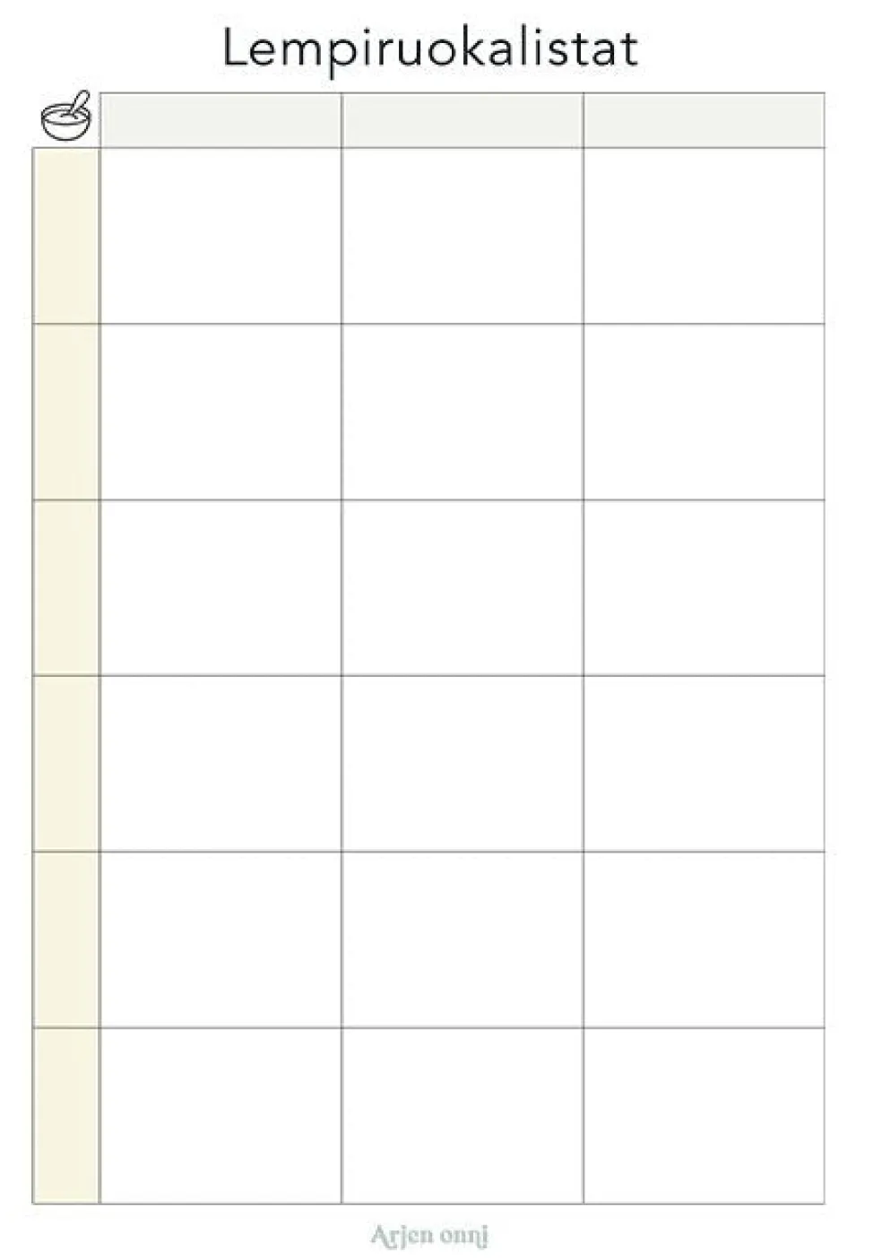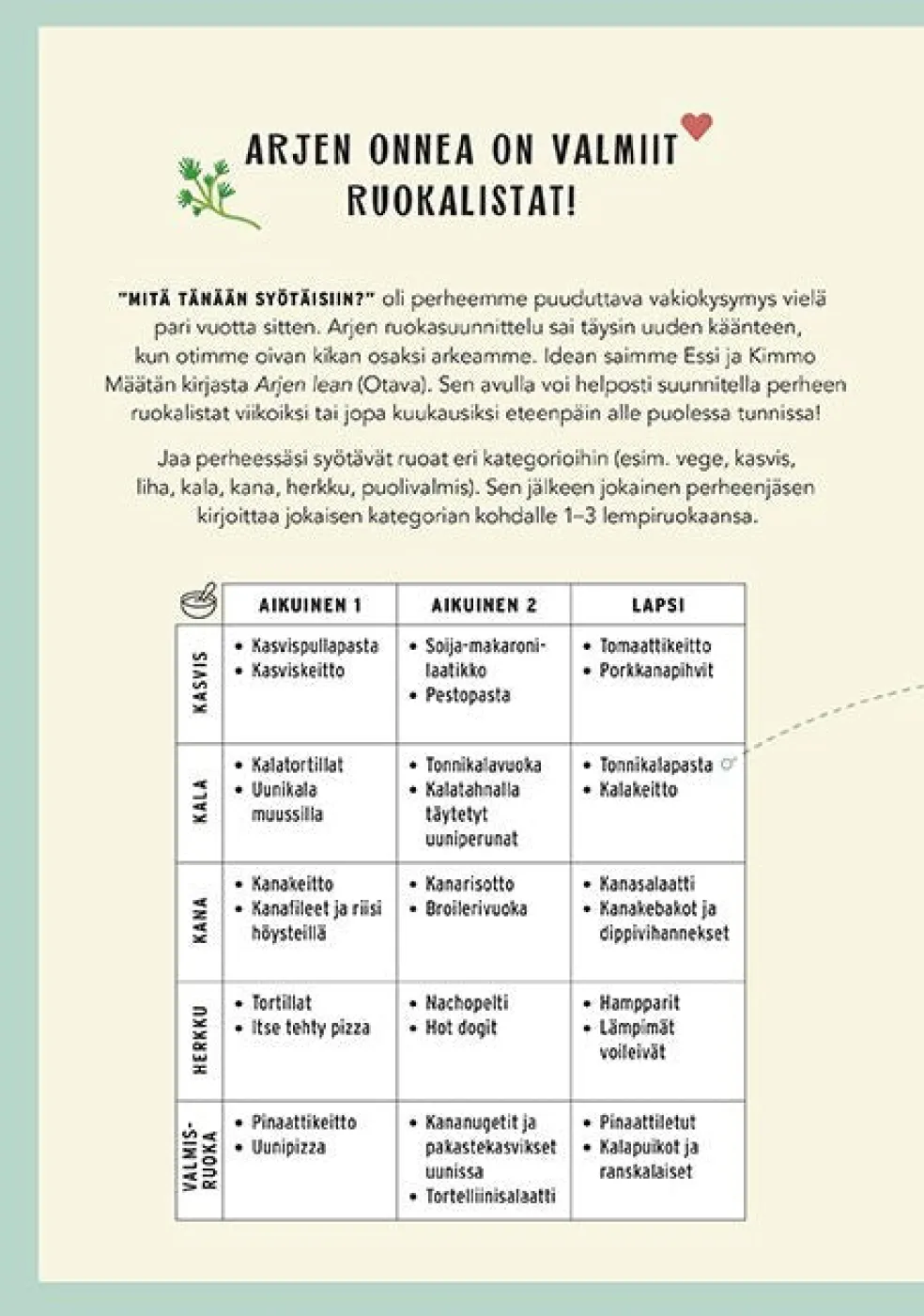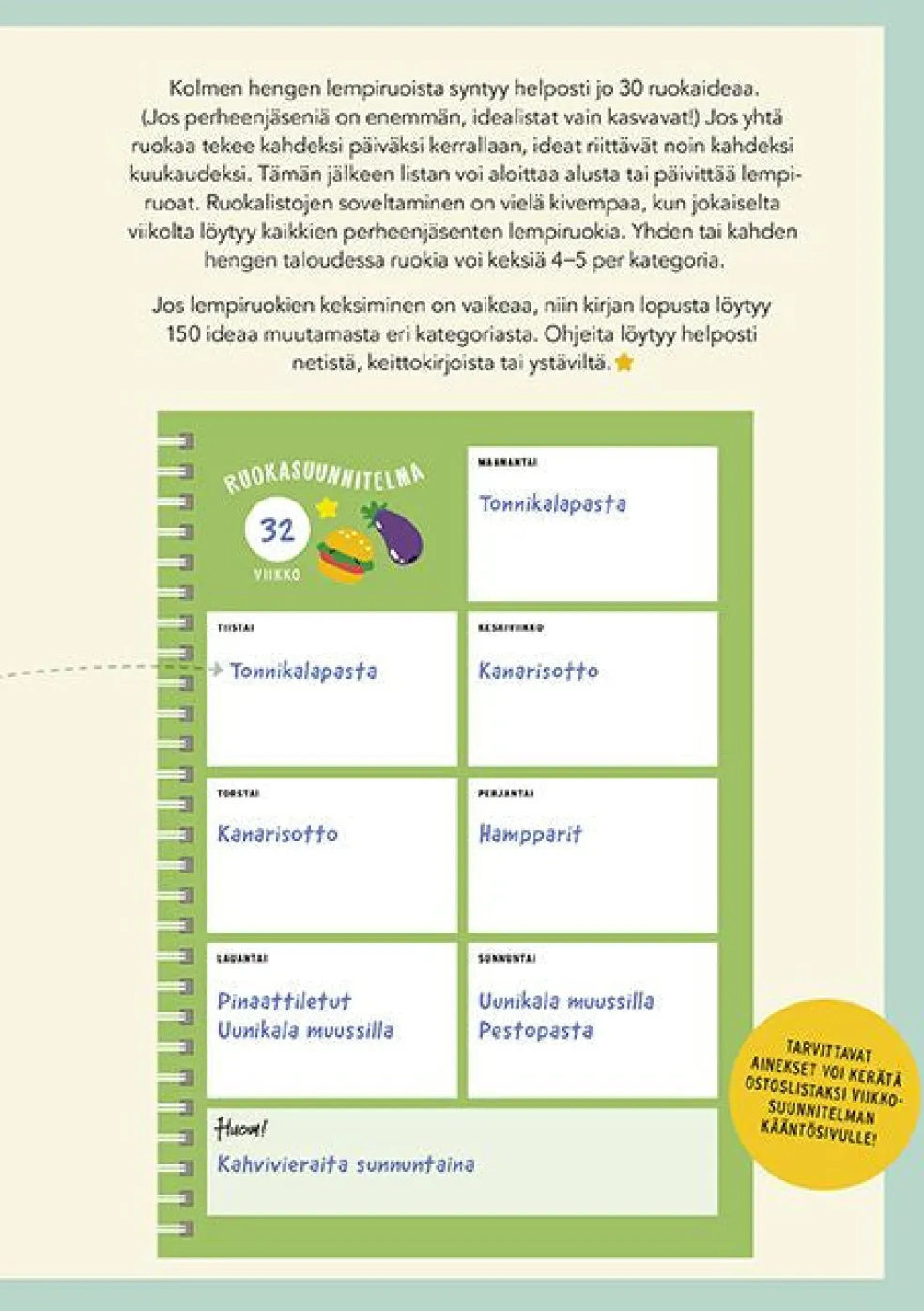 Täytettävä muistikirja sisältää suunnittelupohjat koko vuodeksi sekä monipuoliset ateriaehdotukset eri kategorioista (vege-, liha- jne.). Ruokasuunnitelmavinkin myötä mitä tänään syötäisi -ongelmaa ei enää ole, vaan jokainen perheenjäsen voi toivoa eri kategorioista omat lempiruokansa.