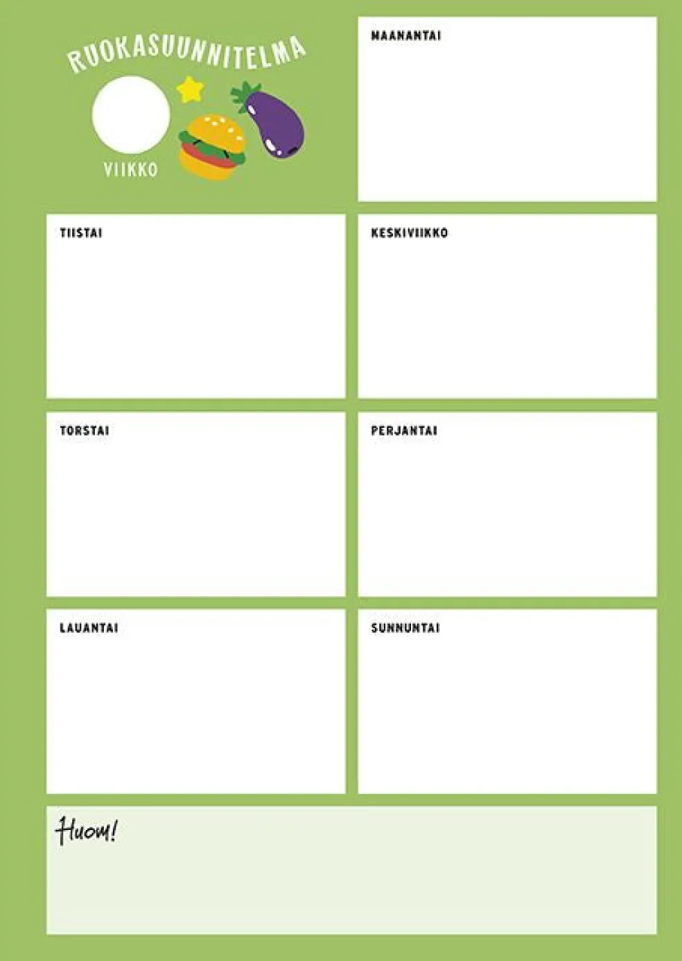 - Avainsanat ruokalistat; ostoslistat; ruokasuunnitelmat
