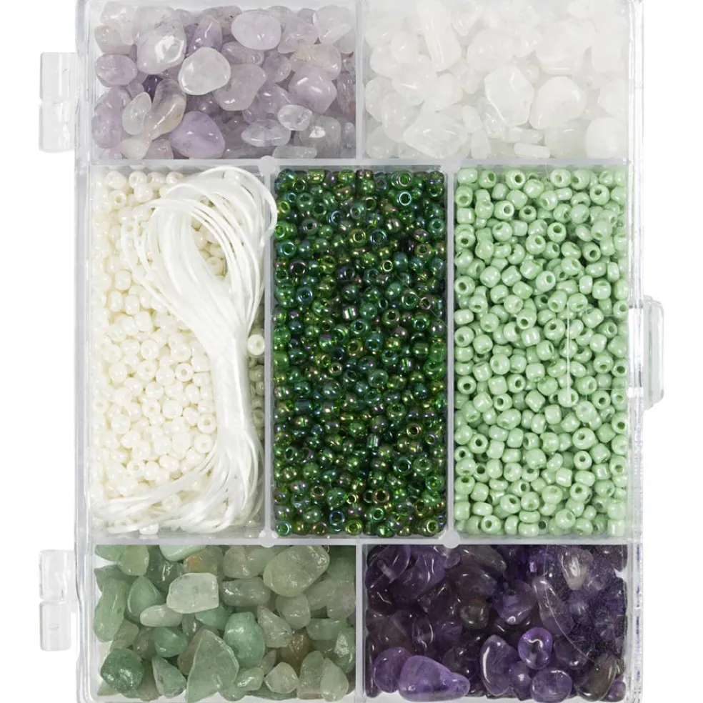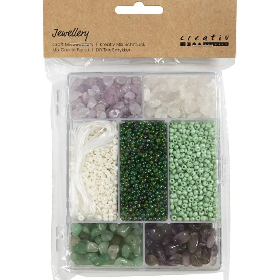 Tällä sekoituksella voit luoda persoonallisia helmikoruja, jotka ovat täynnä positiivista energiaa ja kauniita värileikkejä. Pakkaus sisältää kaikki tarvittavat materiaalit. Jos pidät yksilöllisistä koruista, tämä paketti on täydellinen. Sisältää paljon erilaisia helmiä, joita voit yhdistellä upeiksi koruiksi. Yhdistä esimerkiksi pieniä rocaille-siemenhelmiä kauniisiin puolijalokiviin tai kristalleihin ja luo ainutlaatuisia väriyhdistelmiä. Luovat mahdollisuudet ovat rajattomat. Teet rannekoruja ja kaulakoruja, jotka ovat täynnä positiivista energiaa ja virkistävää symboliikkaa.. Sisältö: Kristalleja, Rocaille-siemenhelmiä, elastista korulankaa ja helmineula. Helmien koko 2,6-10 mm, aukon koko 0,8-1,2 mm. Värit: kirkas, vihreä, mintunvihreä, tummanvioletti/vaaleanvioletti ja helmiäisvalkoinen.