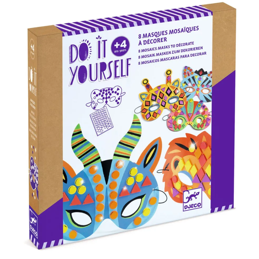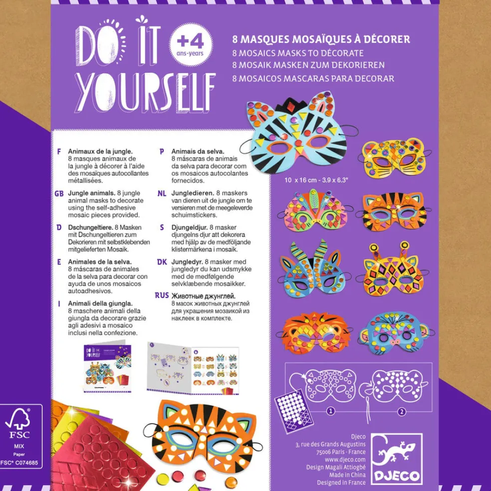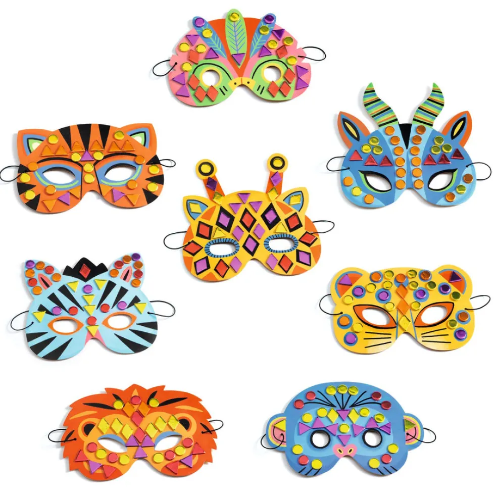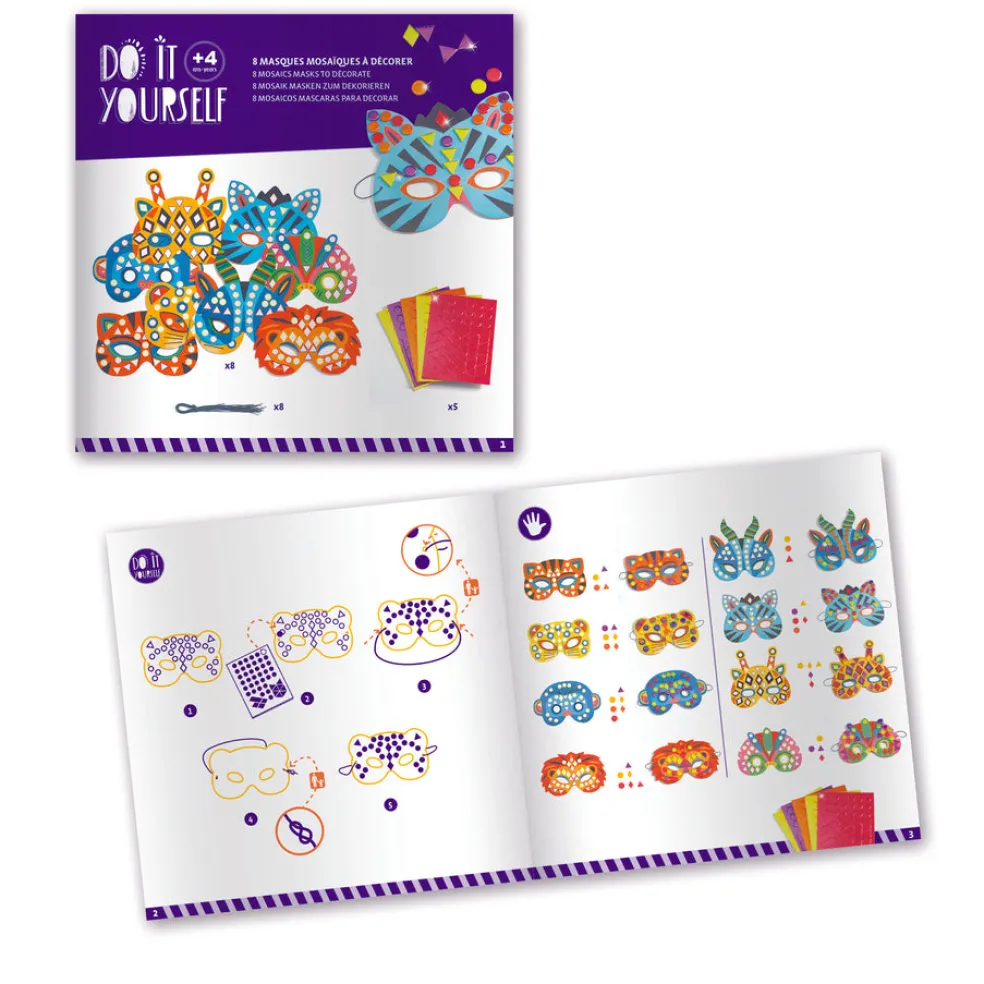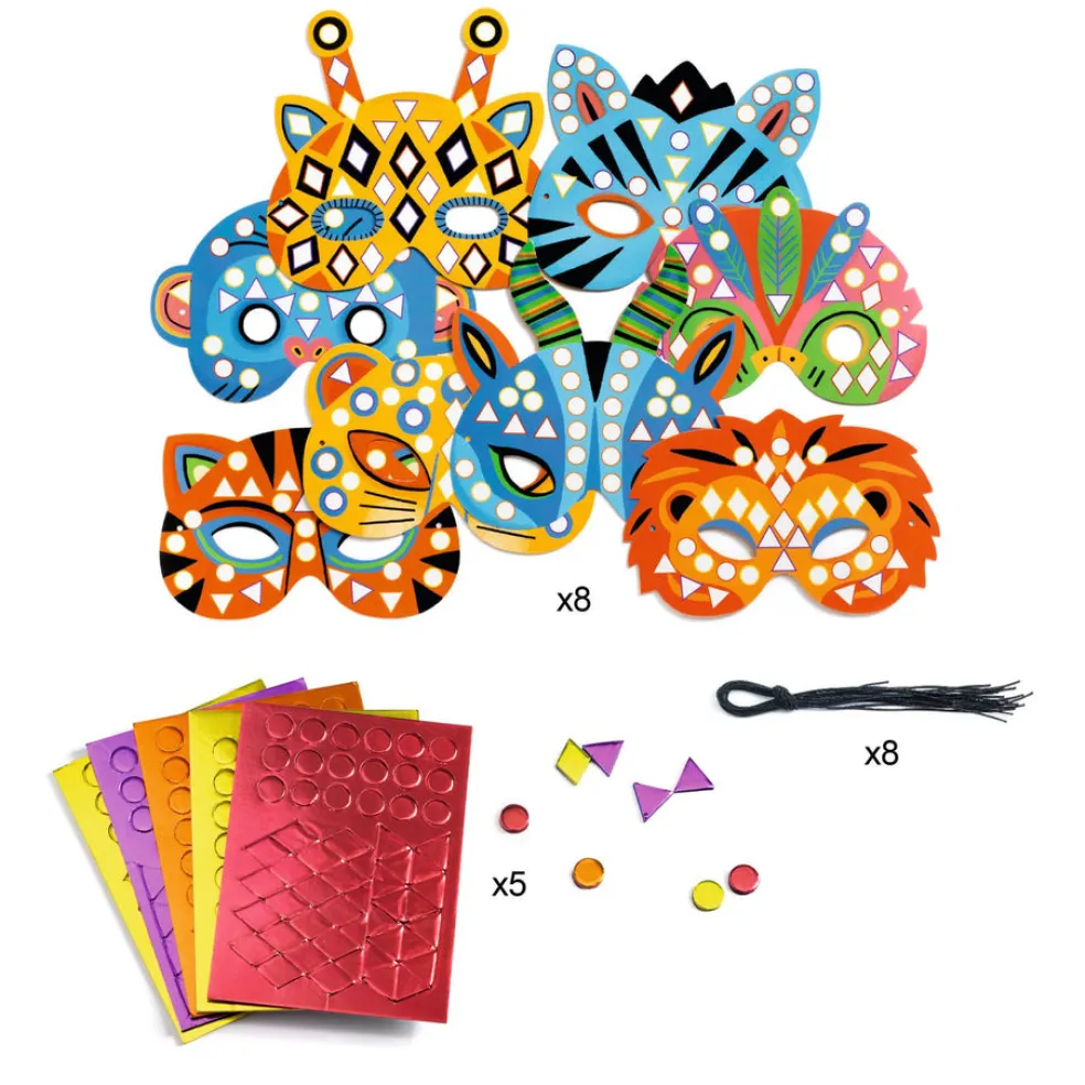 Paketissa on 8 kpl viidakko-aiheisia naamareita, jotka koristellaan mosaiikkitarroilla. Lapsi valitsee mieleisen naaamarin ja koristelee sen ohjeen mukaan. Paketissa on 8 naamaria, 8 kuminauhaa, 5 arkkia metallinhohtoisia mosaiikkitarroija ja kuvallinen ohjevihko.