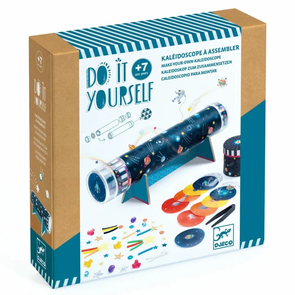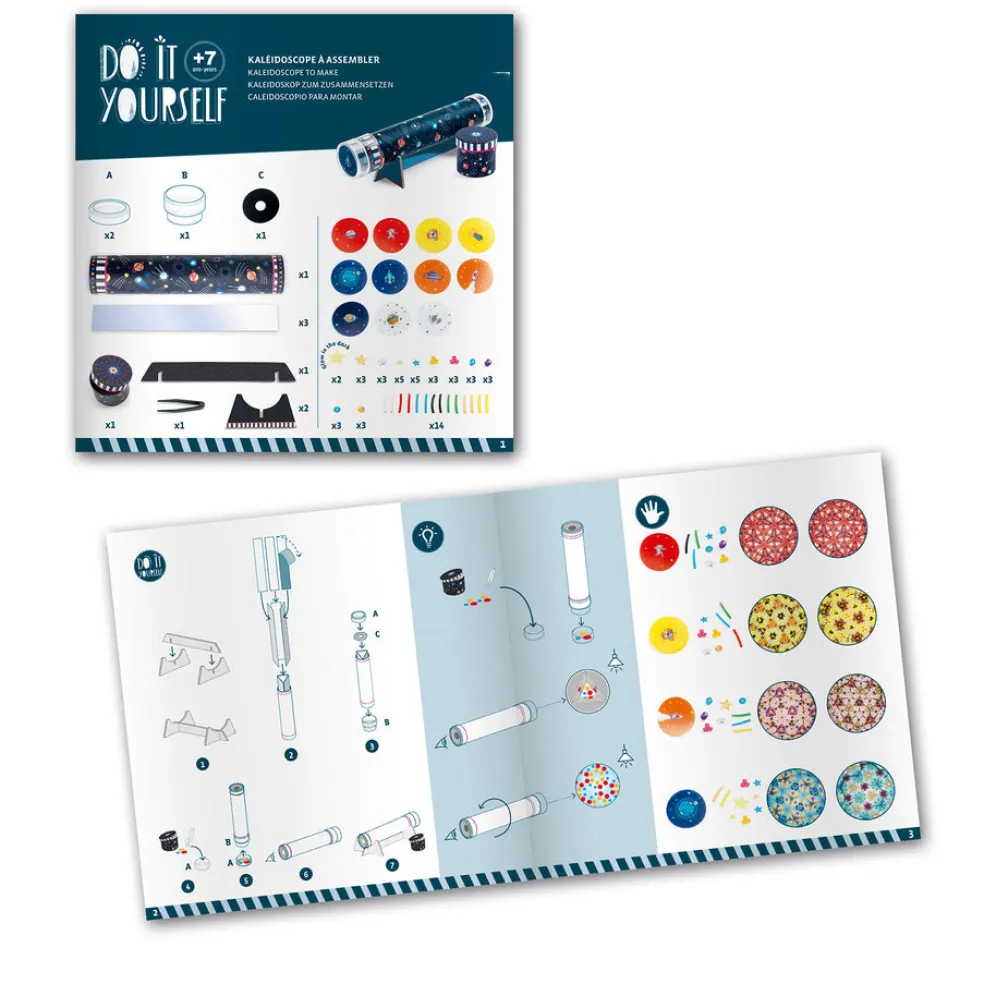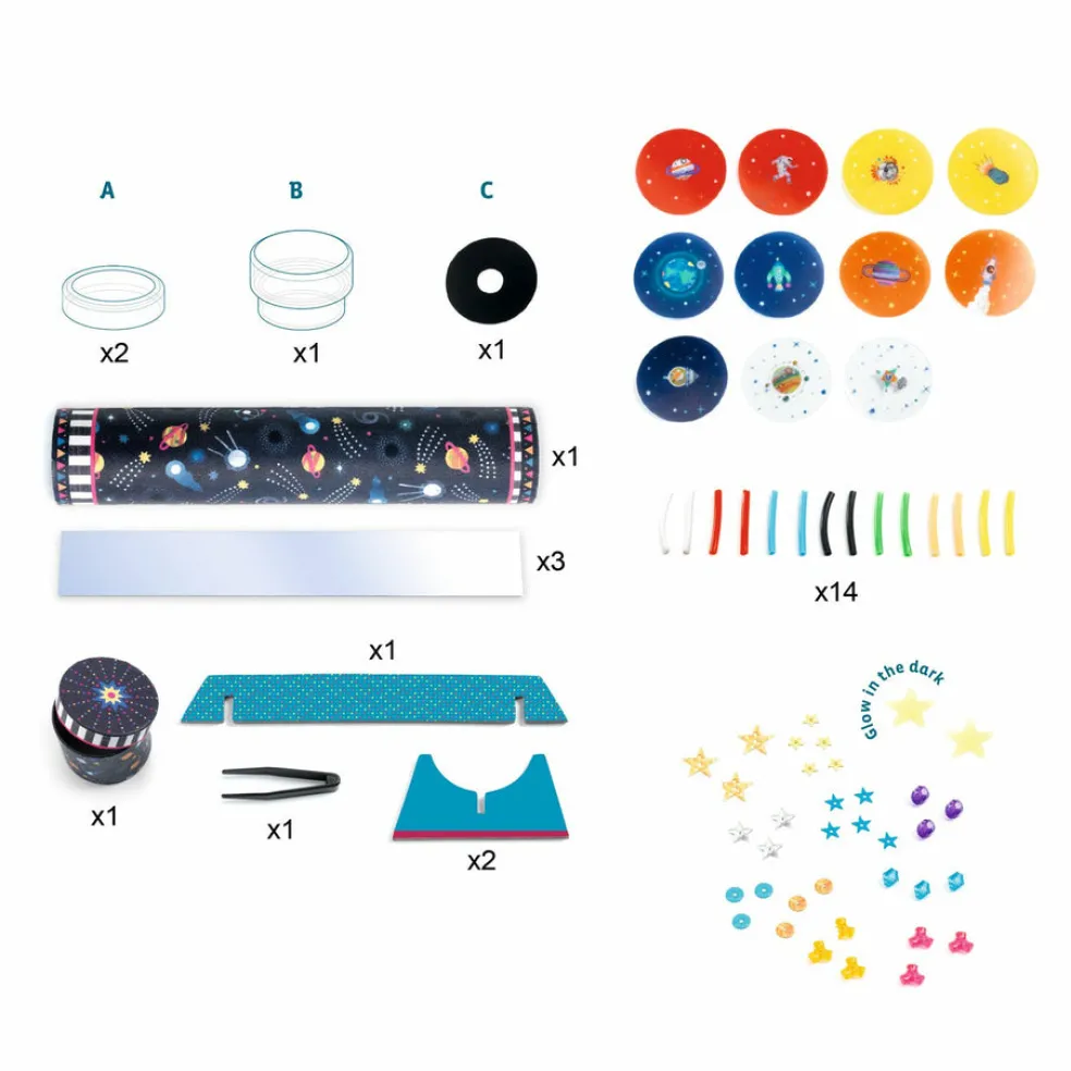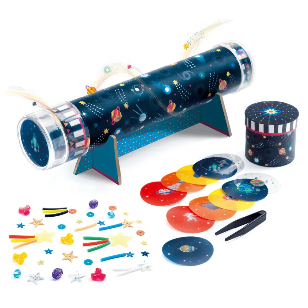 Avaruus-aiheinen kaleidoskooppi! Paketissa on tarvikkeet kaleidoskoopin askarteluun ja kuvallinen ohjevihko. Loputon määrä erilaisia yhdistelmiä, jotka vaikuttavat kuvioihin, jotka kaleidoskoopissa näkyvät.