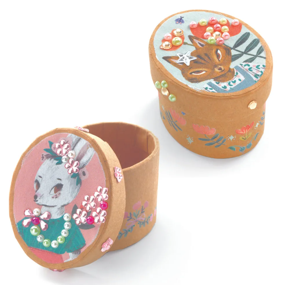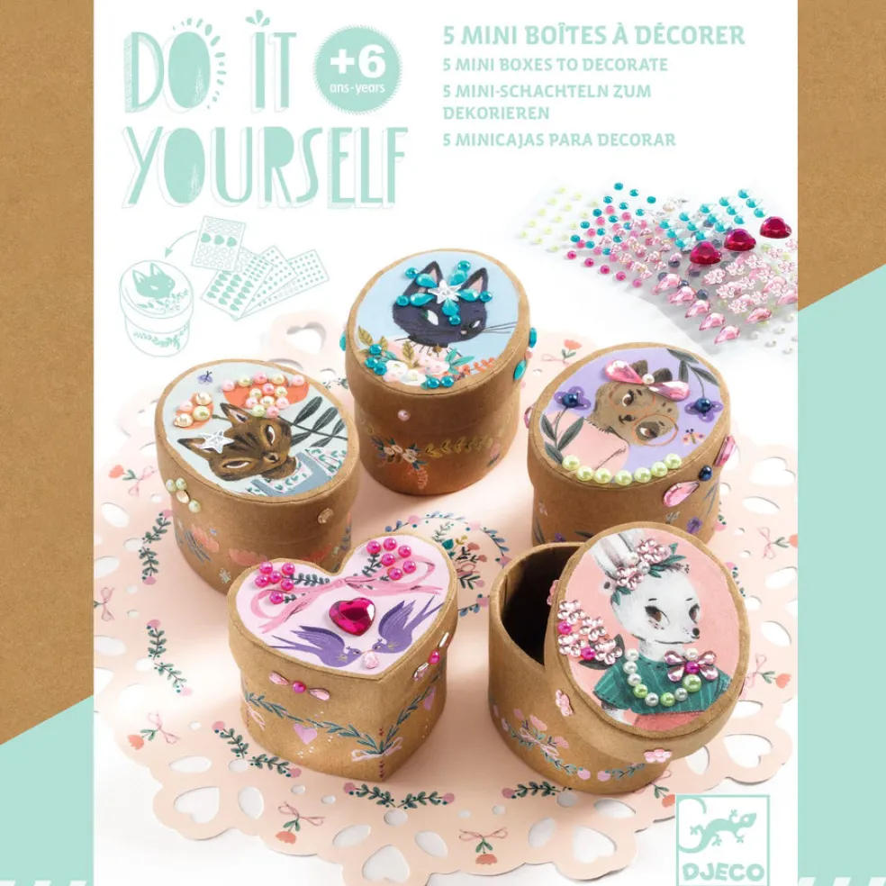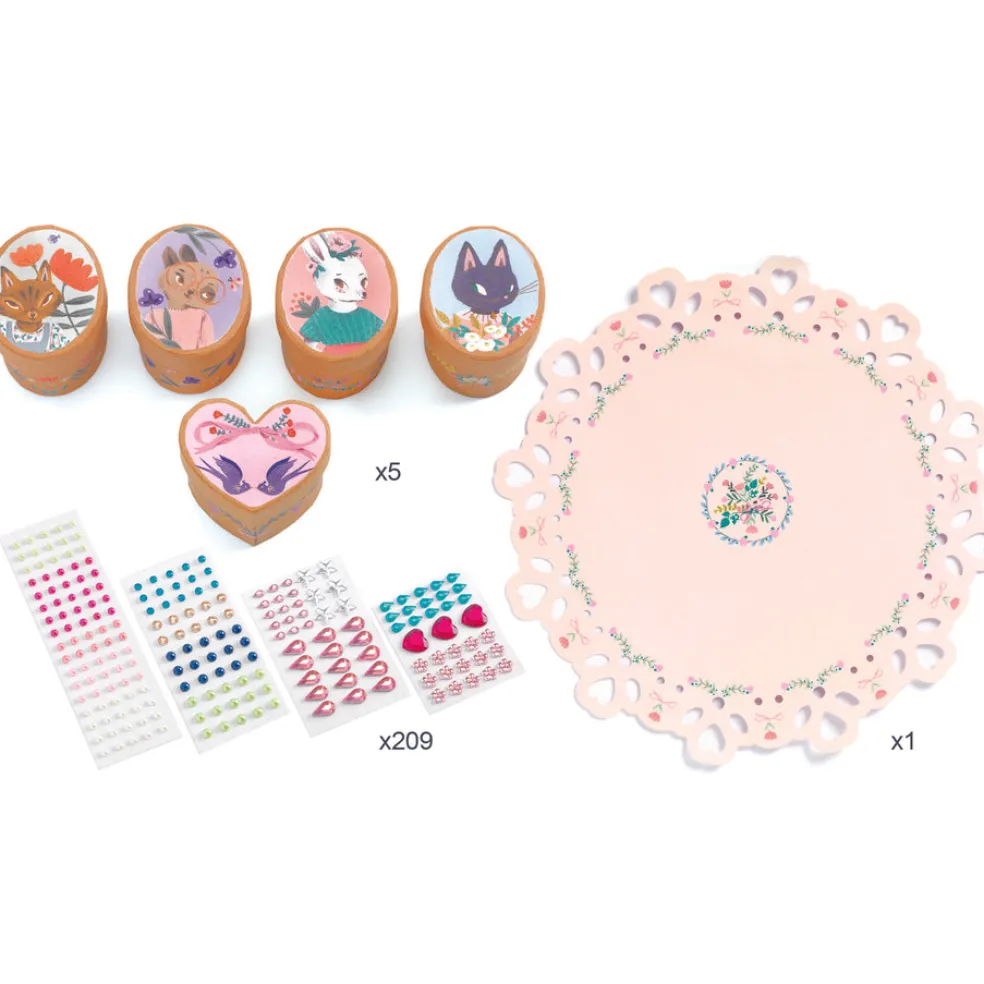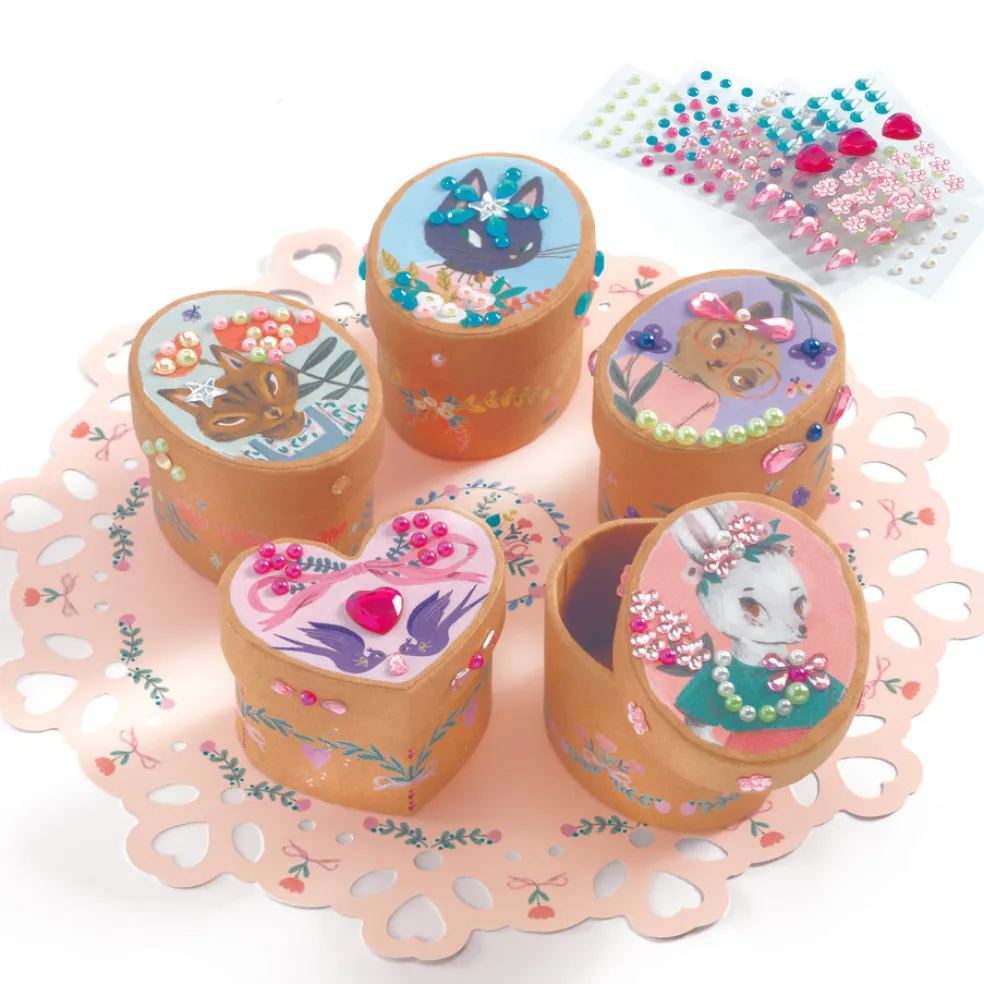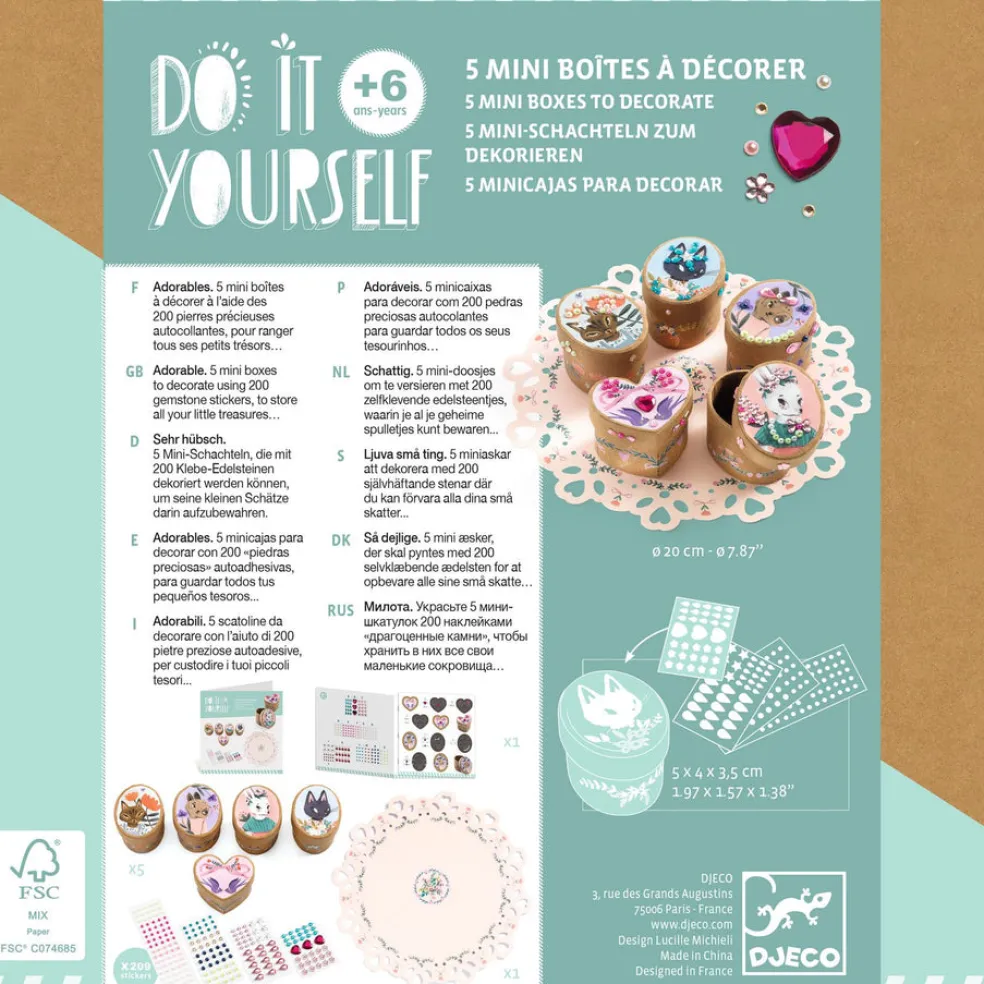 Askartelupaketissa on 5 kpl minirasioita, jotka voi koristella tarra timanteilla (yli 200 kpl). Rasioissa on kiva säilyttää koruja tai muita pieniä aarteita. Kauniin näköisiä! Sisältö: 5 minirasiaa (5 x 4 x 3.5 cm), 4 sarkkia tarratimantteja, koristepaperi rasioiden alle ja kuvallinen ohjevihko., 1 small decorative doily and 1 sheet of step-by-step instructions