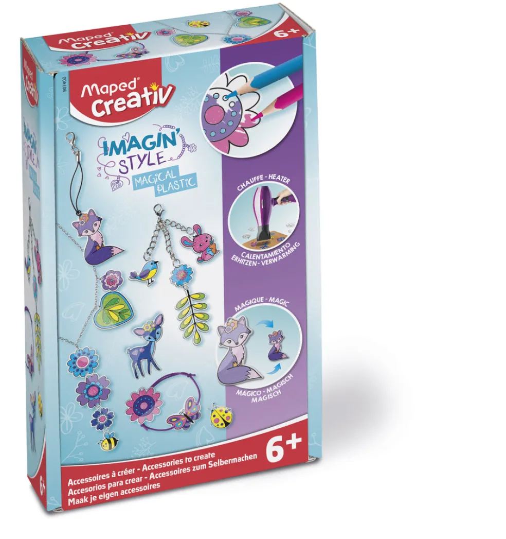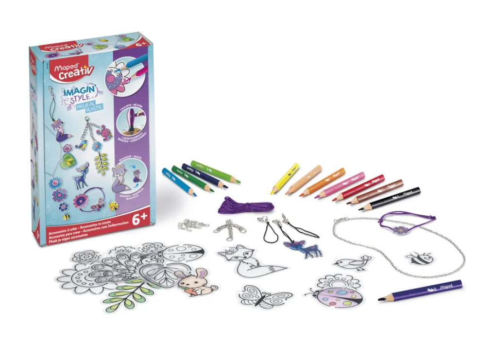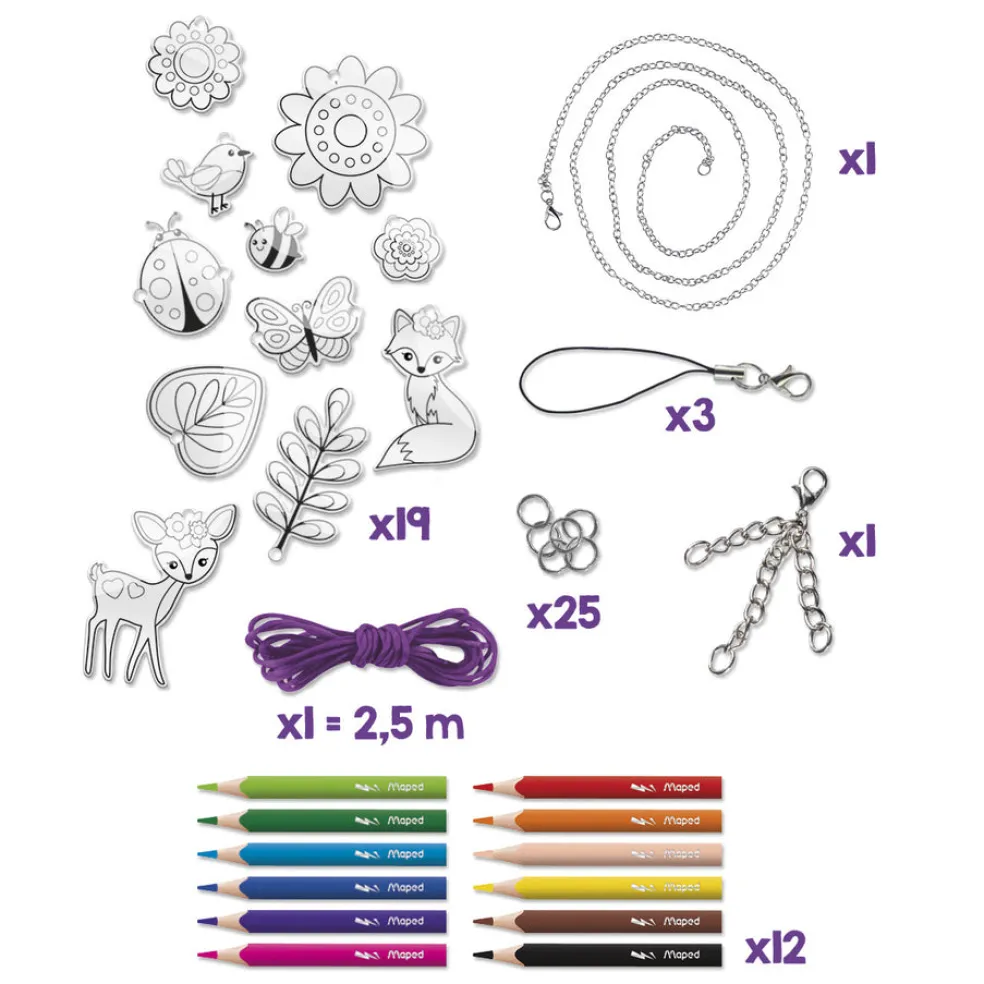 Hauskat tee se itse -eläinkorut. Pakkaus sisältää 19 väritettävää eläinaihetta, 12 värikynää, 2,5m nauhaa, ketju ja 25 liitäntärengasta korujen tekemiseen. Väritetyn kuvan voi viimeistellä lämmittämällä hiustenkuivaajalla tai uunissa.