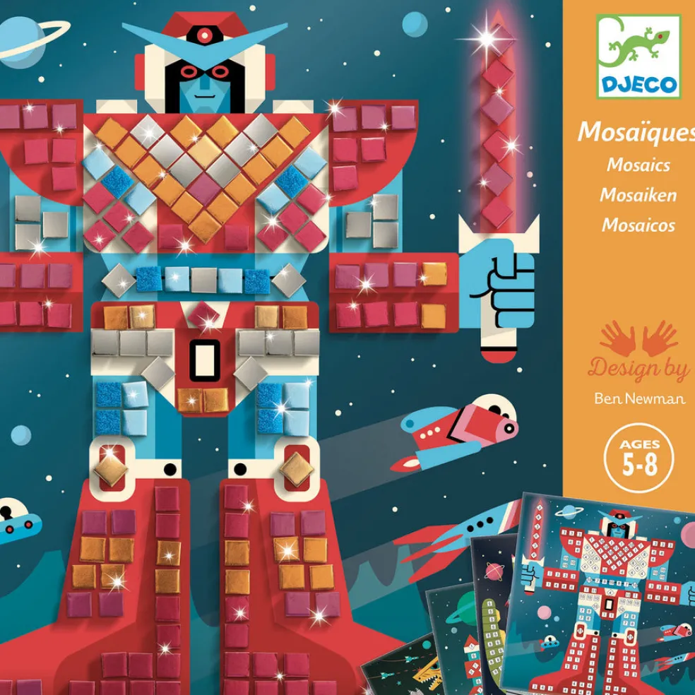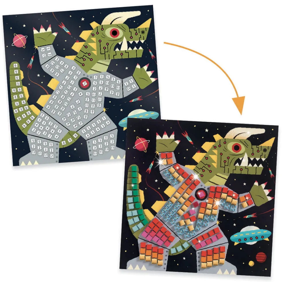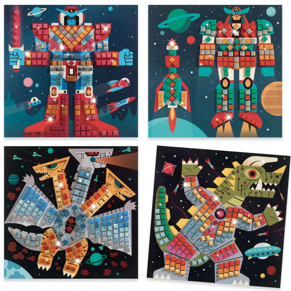 Avaruusaiheinen mosaiikkityö tutustuttaa lapset mosaiikkien maailmaan. Paketissa on 4 pohjaa, joihin liimataan kimaltelevia pehmeitä mosaiikkitarroja numeroiden mukaan. Mukana kuvallinen ohjevihko.