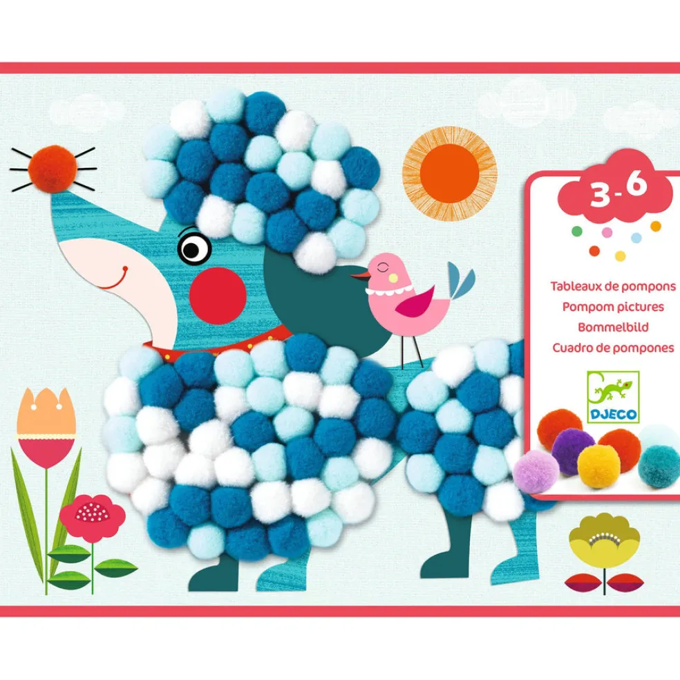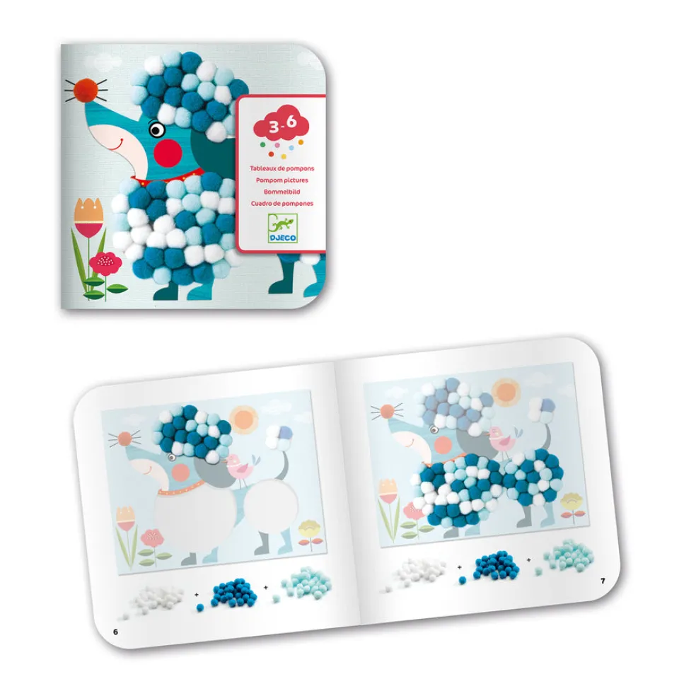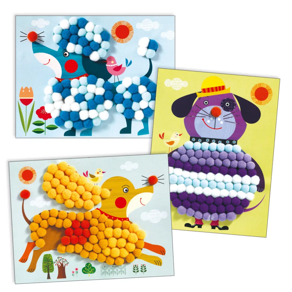 Viihdyttävä kollaasityö on suunniteltu 3-6-vuotiaille. Taustat koristellaan tupsuilla, joita on paketissa yli 300 kpl. Tupsut kiinnitetään kolmeen pohjaan, joissa on valmis liimapinta. Valmiit koirat ovat värikkäitä ja veikeitä.