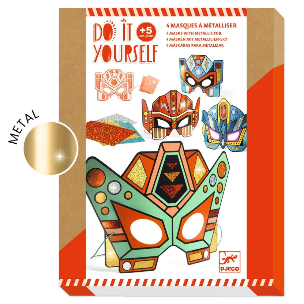 4 naamaria, jotka koristellaan ensin foliolla, sitten kiinnitetään kuminauhat ja naamari on valmis.
