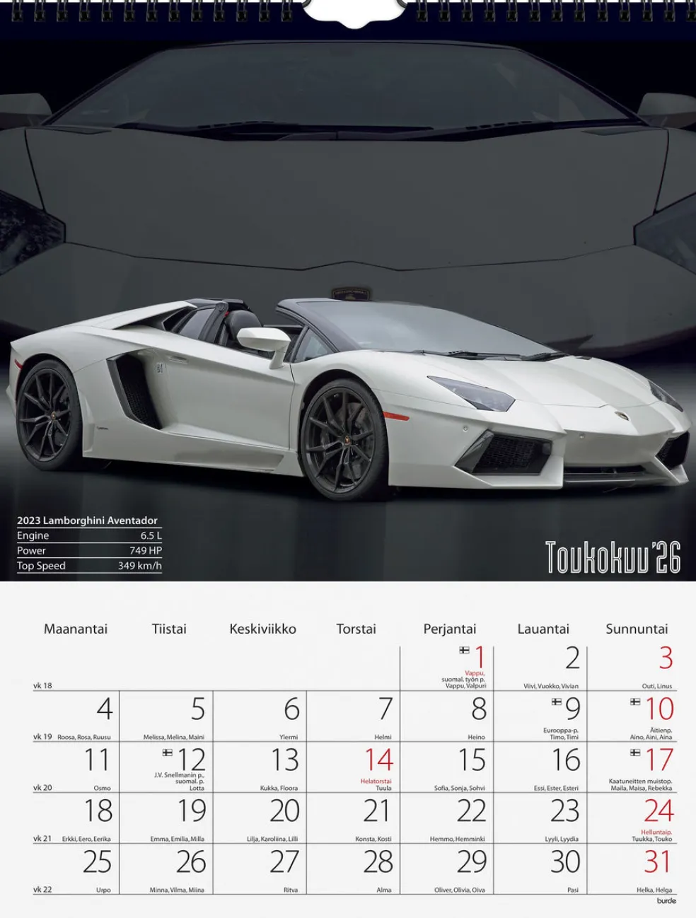 12 hienoa autokuvaa. Kalenteri sisältää nimipäivät, liputuspäivät, kansalliset pyhäpäivät ja kuun vaiheet. Suomenkielinen. Parikierresidottu. FSC®. Koko: 295×390 mm.