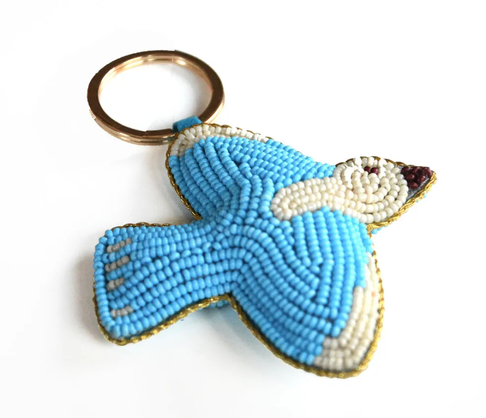 Sinitaivaalla lentelevä suloinen sinipikkulintu on päässyt Mum’sin avaimenperään. Ihastuttava Lintu-sarjaan kuuluva avaimenperä kultalenkillä ja lasihelmikirjailun valmistaneen käsityöläisen signeerauksella.
