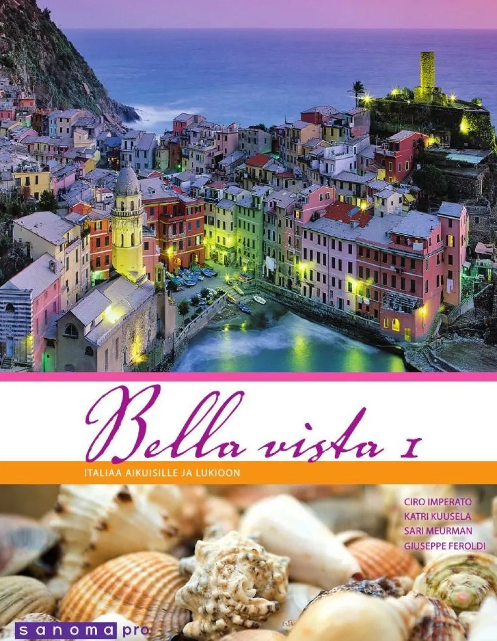 Bella vista 1 on näköala kauniiseen Italiaan. Se esittelee Italian kielen, kulttuurin ja italialaisten elämän. Bella vista 1 sisältää italian kielen alkeet ja perusteet. Se soveltuu erityisesti aikuisille, mutta myös lukion B3-kieleen (kurssit 1 – 3). Aihepiirit kattavat arkikielen tilanteita ja sanastoa. Kielioppi on integroitu kappaleisiin asteittain syventäen. Kulttuuri- ja maantuntemustiedot on esitetty kiinnostavasti ja kattavasti.