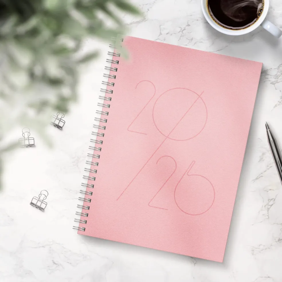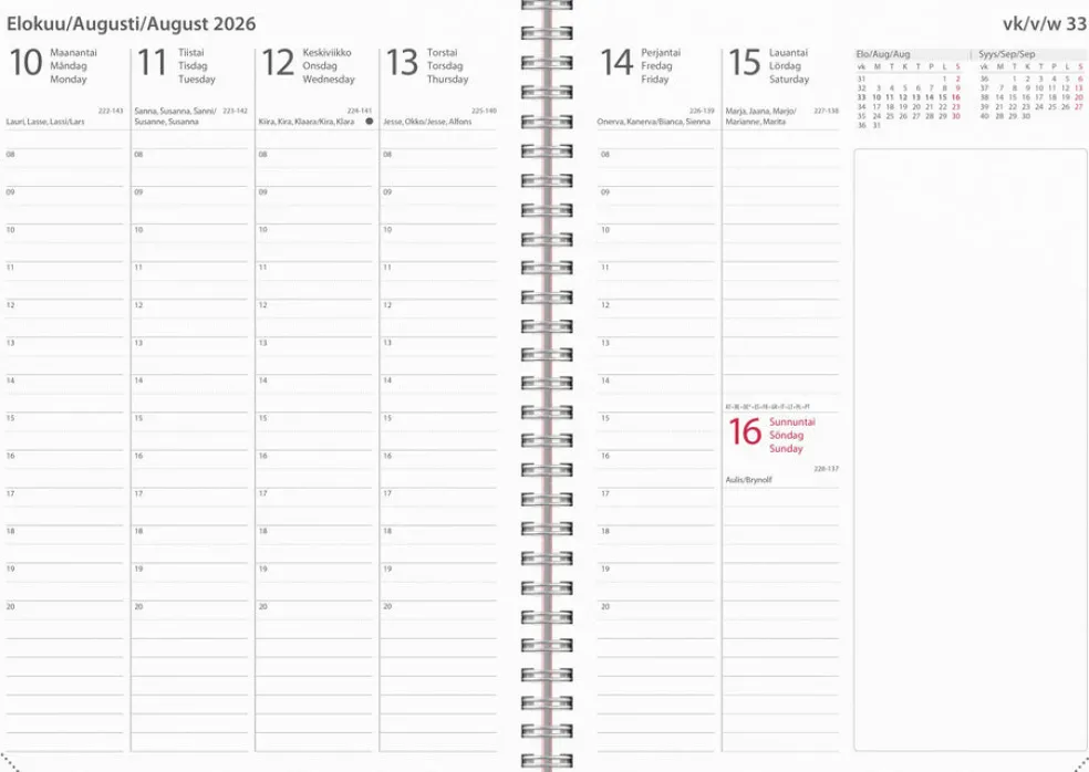 Painettu keinonahkakansi. Kalenterin aukeamalla yksi viikko, tuntijaotus 08-20, palsta muistiinpanoille, kuluvan ja seuraavan kuukauden kalenteritaulukot. Kalenteri sisältää nimipäivät, juhlapyhät, liputuspäivät, kuun vaiheet, vuosisuunnitelmat kuluvalle ja seuraavalle vuodelle, vuosiruudukot edelliselle, kuluvalle ja kahdelle seuraavalle vuodelle, kalendaariset tiedot, auringon nousu- ja laskuajat, yleiset pyhäpäivät maailmalla ja muistiinpanosivut. Kalenteriosa: vk 48 2025-vk 53 2026/2027. Kolmikielinen: suomi/ruotsi/englanti. Parikierresidottu. FSC®-paperi. Koko: 148×210 mm (A5).