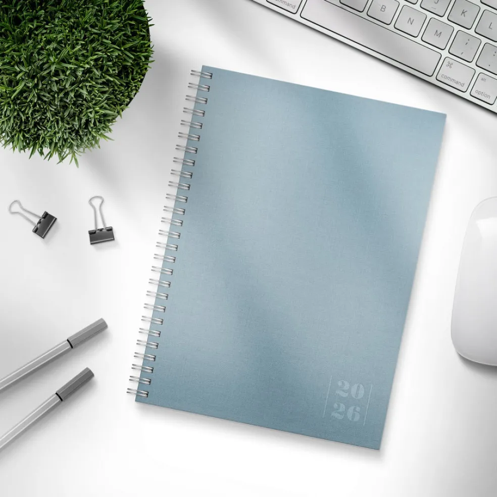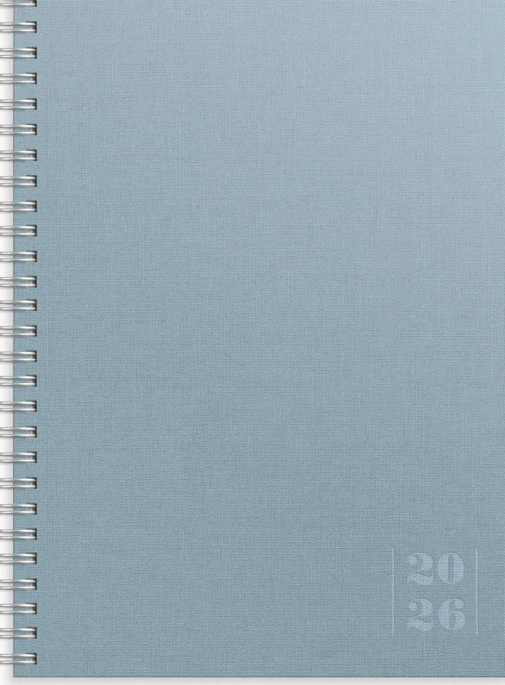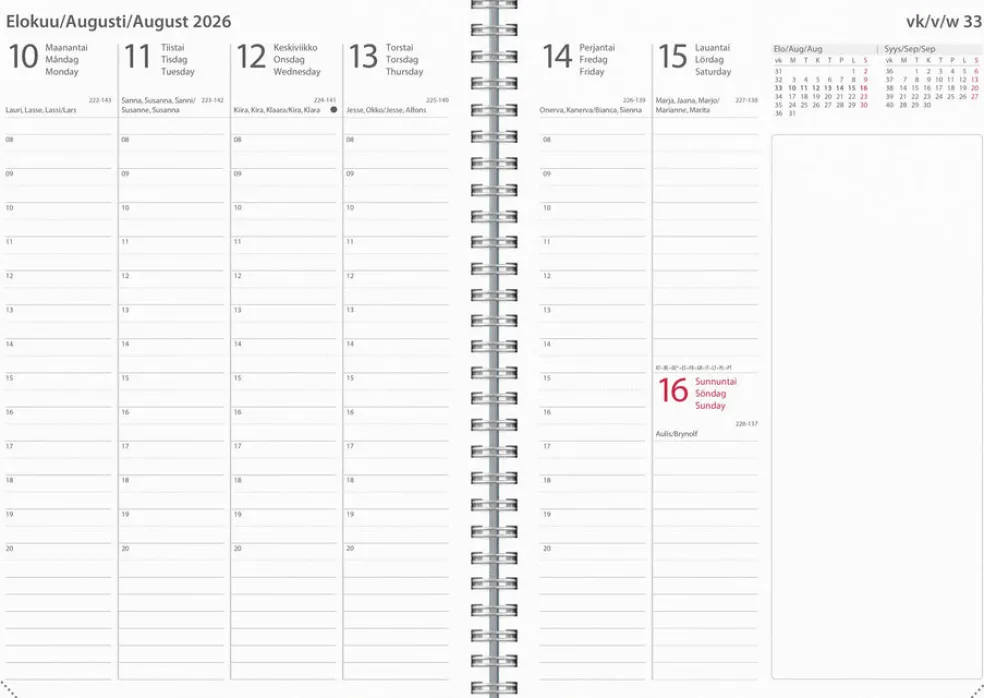 Pellavatekstiilikansi. Kalenterin aukeamalla yksi viikko, tuntijaotus 08-20, palsta muistiinpanoille, kuluvan ja seuraavan kuukauden kalenteritaulukot. Kalenteri sisältää nimipäivät, juhlapyhät, liputuspäivät, kuun vaiheet, vuosisuunnitelmat kuluvalle ja seuraavalle vuodelle, vuosiruudukot edelliselle, kuluvalle ja kahdelle seuraavalle vuodelle, kalendaariset tiedot, auringon nousu- ja laskuajat, yleiset pyhäpäivät maailmalla ja muistiinpanosivut. Kalenteriosa: vk 48 2025-vk 53 2026/2027. Kolmikielinen: suomi/ruotsi/englanti. Parikierresidottu. FSC®. Koko: 148×210 mm (A5).