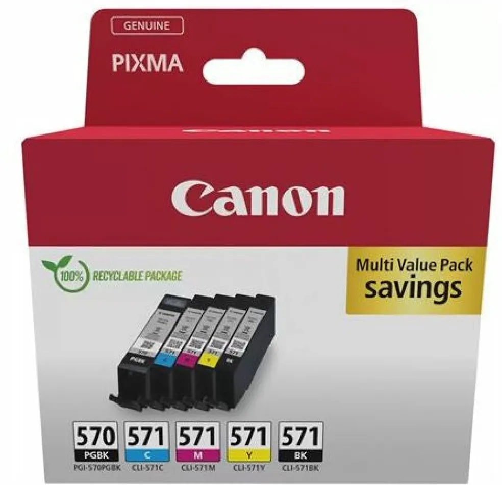 Canon PGI-570/CLI-571 PGBK/BK/C/M/Y Multi Pack – 5 pakettia – pigmentoitu musta, musta, keltainen, sinivihreä, magenta – alkuperäinen – laatikko – mustesäiliö malleihin PIXMA TS5051, TS5053, TS5055, TS6050, TS6051, TS6052, TS8051, TS8052, TS9050, TS9055