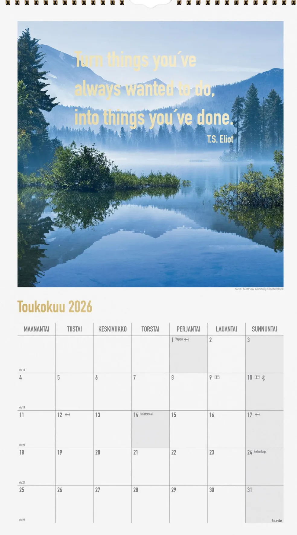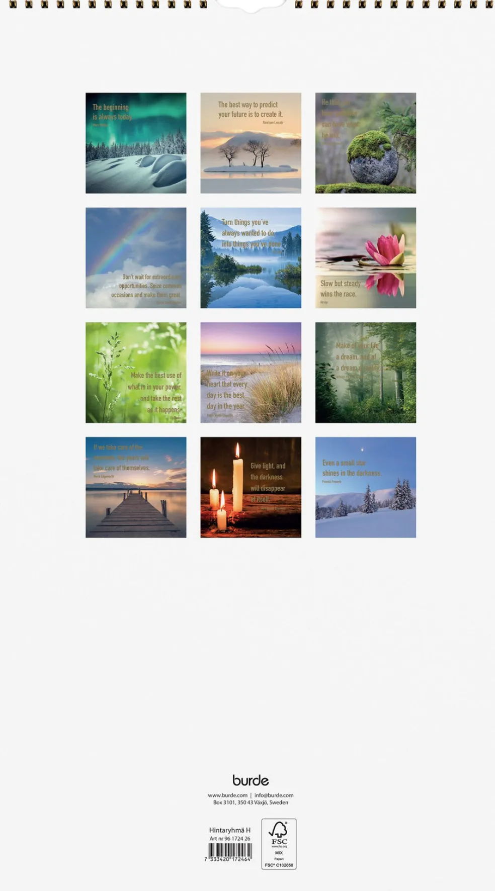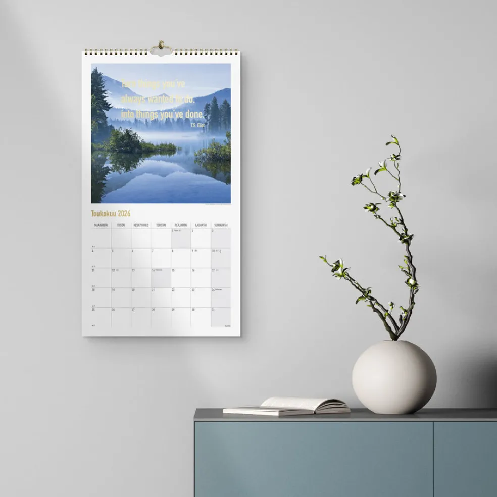 12 kuvaa. Seinäkalenteri, jokaisella aukeamalla yksi kuukausi. Kalenteri sisältää kauniita kuvia, mietelauseita kultapainatuksella, juhlapyhät ja liputuspäivät. Suomenkielinen. Parikierresidottu. FSC®.