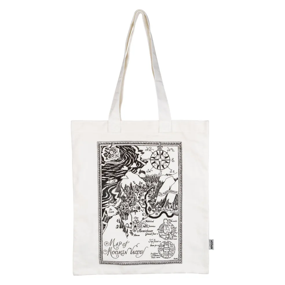 Kierrätetystä puuvillasta valmistettu kangaskassi, jossa on tukevat kantokahvat. Kassin toisella puolella on mustavalkoinen Muumilaakson kartta.