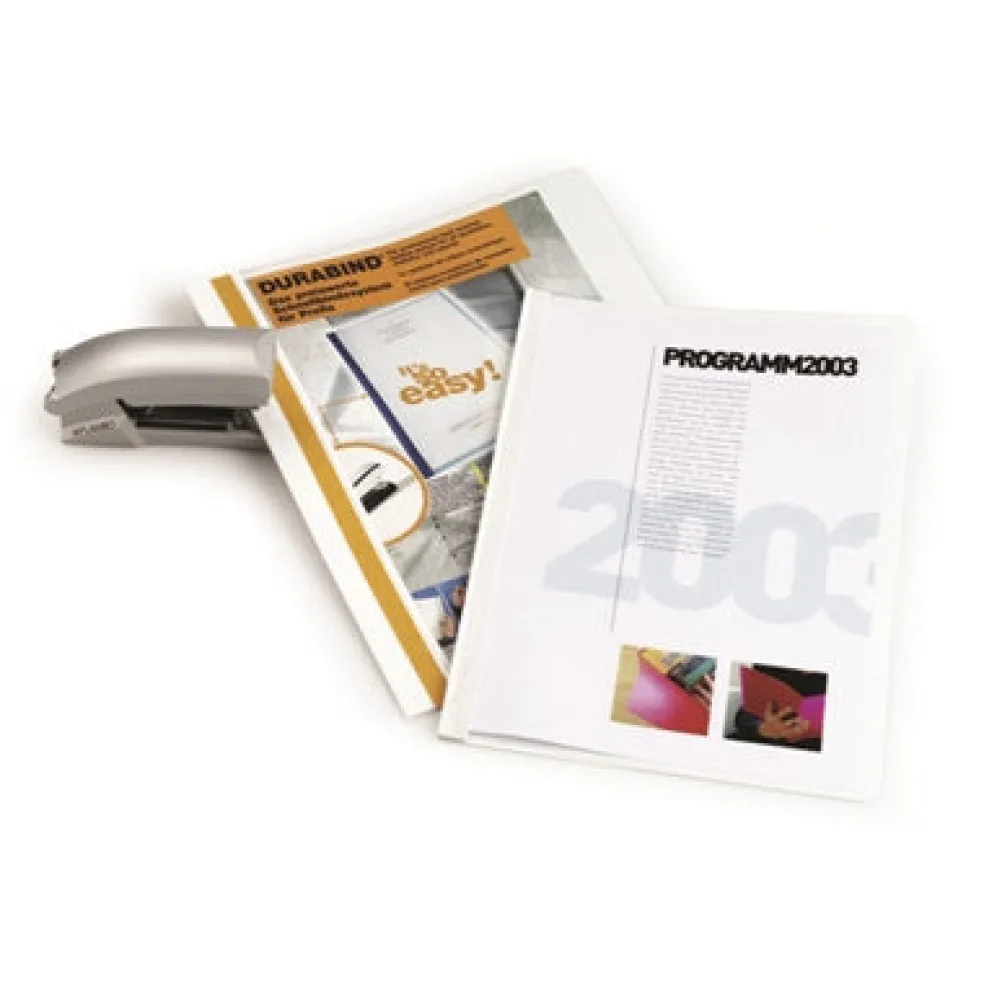 Esitekansio Durabind 2250 A4 PVC valkoinen. Pysyvään sidontaan, paperit nidotaan kiinni kansioon. Teippiliuskat poistetaan ja reuna liimataan niittien päälle. Kapasiteetti 30 arkkia. Mapitusliuska takakannessa. Väri valkoinen.