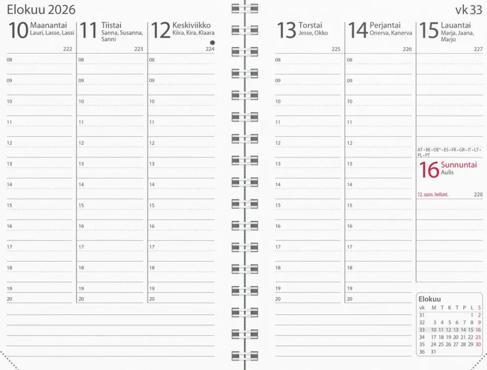 Kalenterin aukeamalla yksi viikko, tuntijaotus 08-20 ja kuluvan kuukauden kalenteritaulukko. Kalenteri sisältää nimipäivät, kansalliset pyhäpäivät, liputuspäivät, kuun vaiheet, kalendaariset tiedot, vuosisuunnitelmat kuluvalle ja seuraavalle vuodelle, vuosiruudukot kuluvalle ja seuraavalle vuodelle sekä erillisen muistilehtiön. Kalenteriosa: vk 50 2025-vk 53 2026/2027. Suomenkielinen. Parikierresidottu. FSC®-paperi. Koko: 83×127 mm.