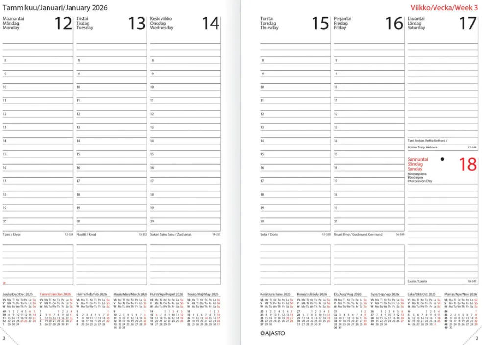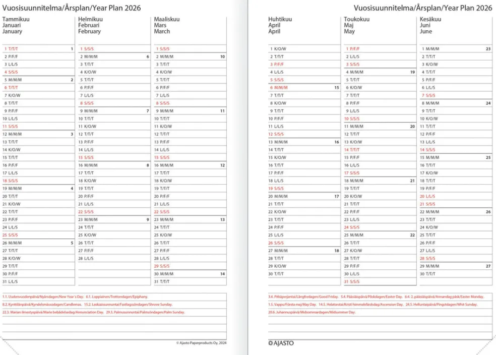 Koko 148 x 210 mm (A5); sidottu; kielisyys: suomi, ruotsi, englanti; päiväkirja 52/2025–53/2026; vuosisuunnitelmat 2026 ja 2027; liputuspäivät Suomessa; kansalliset vapaapäivät päiväkirjan sivuilla ja luettelona; suomalaiset ja suomenruotsalaiset nimipäivät; kansainvälinen aika; auringon nousu- ja laskuajat (Helsinki, Oulu); runsaasti muistiinpanotilaa; Suomi–Eurooppa –kartasto; irrallinen muistilehtiö; FSC®-sertifioitu tuote.