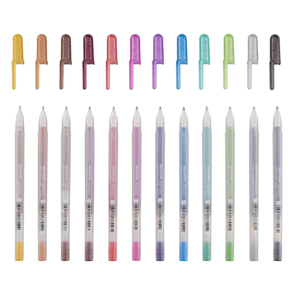 Sakuran 12 geelikynän metallisävy-lajitelma. Metallisävyt omaavat hohtavan, lähes taianomaisen jäljen valkoisella, mustalla ja kiiltävällä paperilla. Sopivat hyvin kirjoittamiseen, piirtämiseen, koristeluun, skräppäykseen ym. Säilytetään vaakatasossa. Kosteudenkestävä – ei sotke. Kärjen erikoisrakenne takaa erittäin laadukkaan tuotteen ja tasaisen musteenjuoksun. Kynää ei tarvitse painaa.