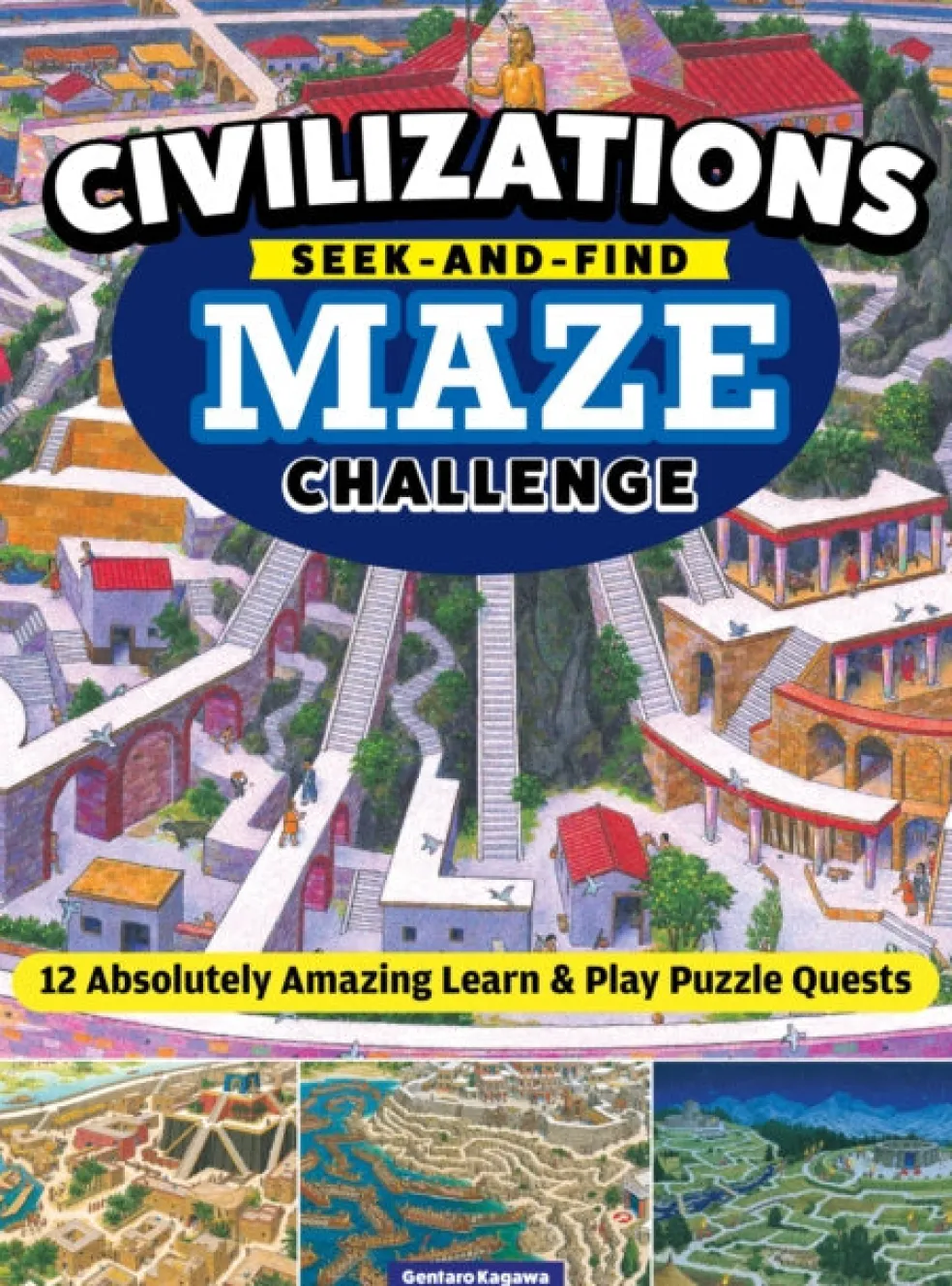 This book is part of the best-selling ”Learn by Playing” maze picture book series by Japanese author and illustrator Gentaro Kagawa. The 12 highly detailed, beautifully illustrated, and visually accurate maze designs are filled with quizzes, riddles, and hidden objects to solve the quest. As a child wanders through the forest, they find a pyramid-shaped piece of glass that reveals a mysterious pattern when held in the light. As the child further explores the forest, they find Ancient Japanese Ruins and must reveal what the mysterious pattern means and solve the maze to find the key-to-the-gate-of-time-and-space. Throughout, different keys must be found to enter a new civilization where hidden objects must be found and mazes solved, all to arrive in the Lost City of Atlantis. Each maze shares facts about its origins, inhabitants, animals, and vegetation. Clues are offered to help solve each maze, as well as an answer key.