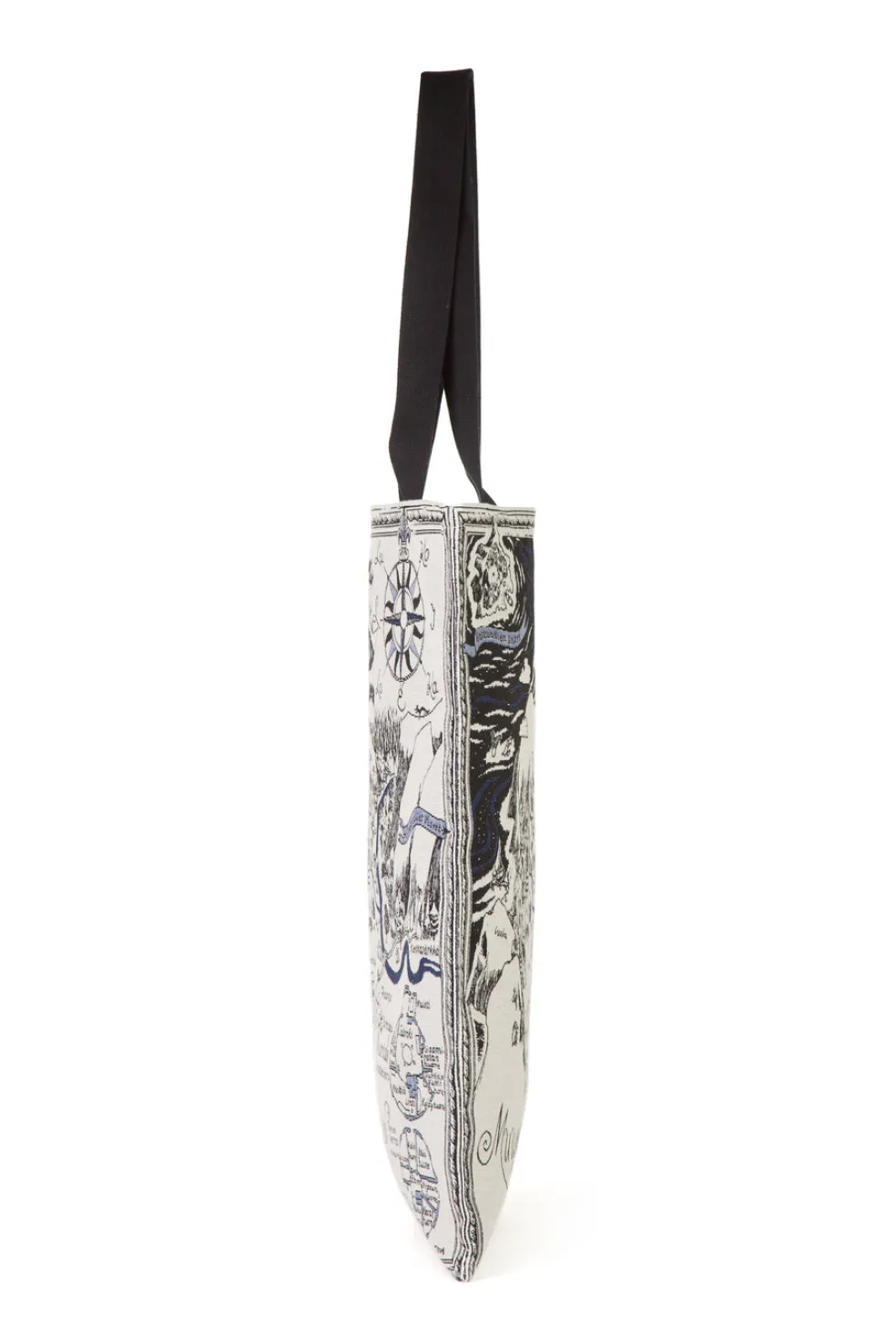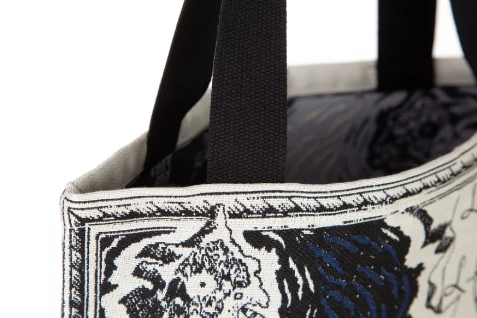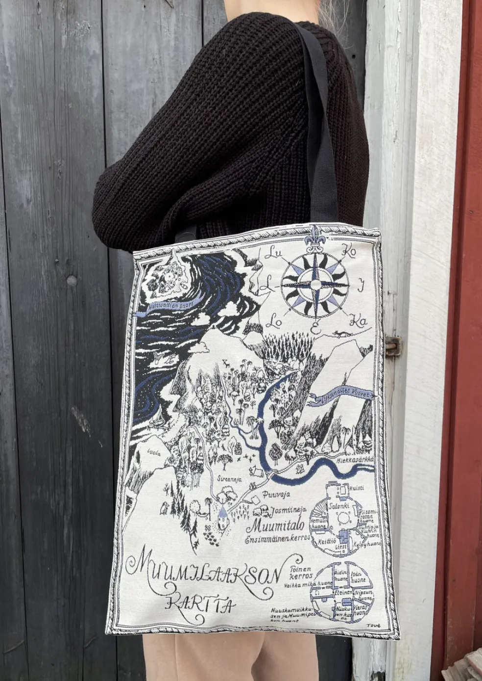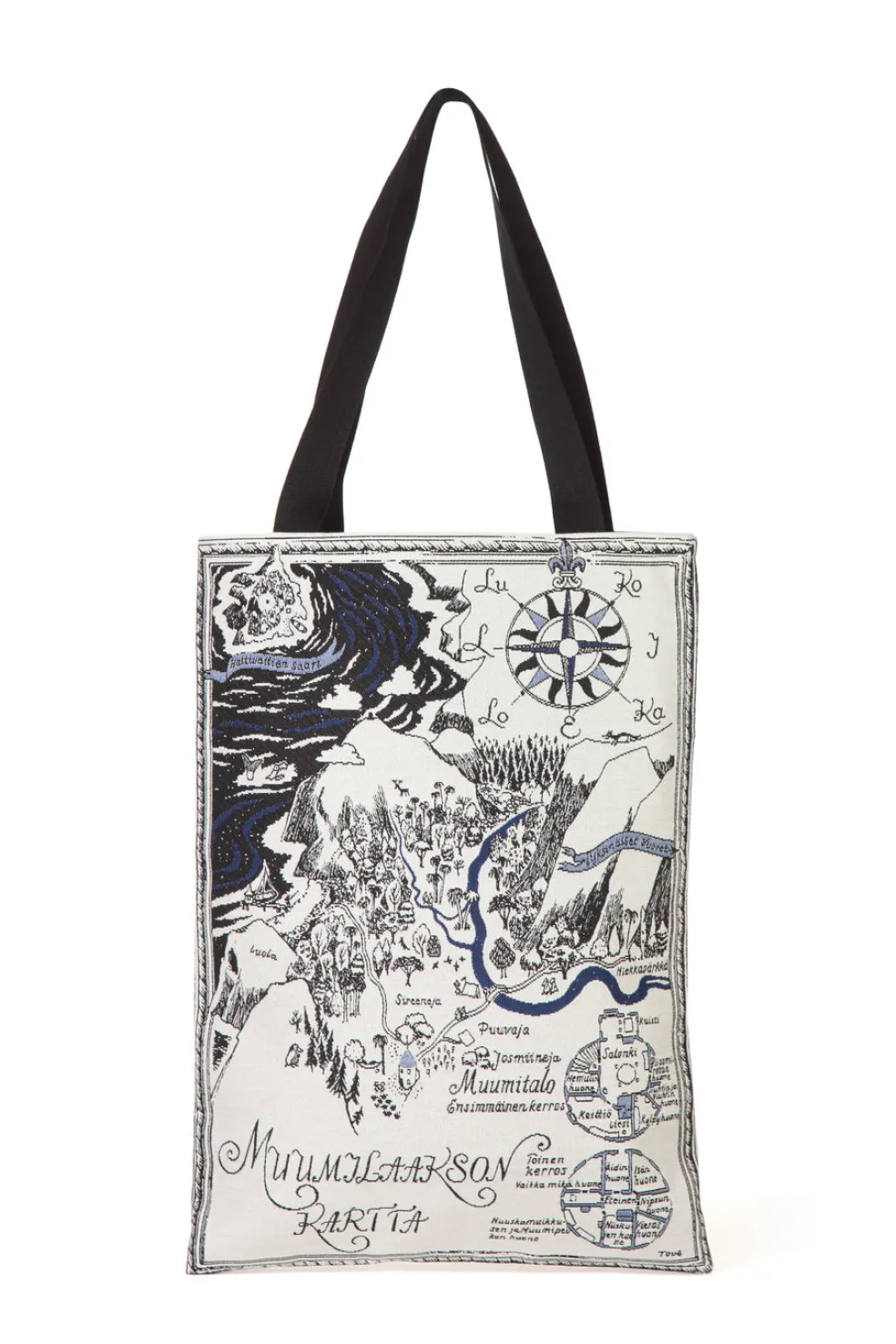 Tukevassa gobeliinikankaisessa kassissa on upea kuva Muumi-laakson kartasta. Tove Janssonin alkuperäistä muumikuvitusta. Kassin koko 34 x 47 cm, olalle ulottuvat kantohihnat 65 cm. Värit valkoinen/musta/sininen ©Moomin Characters TM, avainlipputunnus 4978008