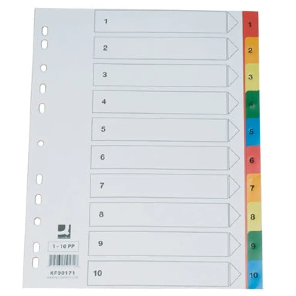 A4 kokoinen hakemisto, jossa on värilliset polypropeeniset lehdet. Painettu etusivu ja kielekkeet. Numerot 1-10.