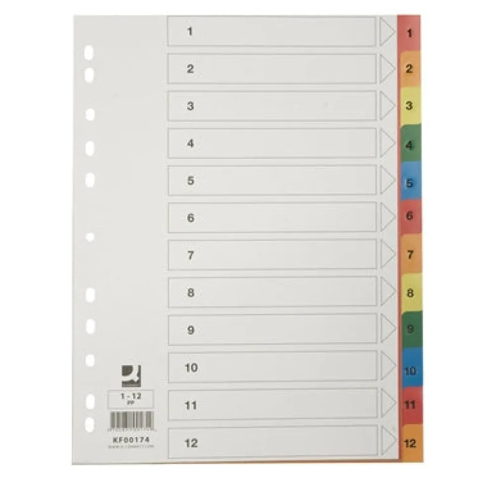 Q-CONNECT® muovihakemistossa on värilliset polypropeeniset lehdet. Hakemiston kansilehti on vaalkoista kartonkia. Painettu etusivu ja kielekkeet. Numerot 1-12.