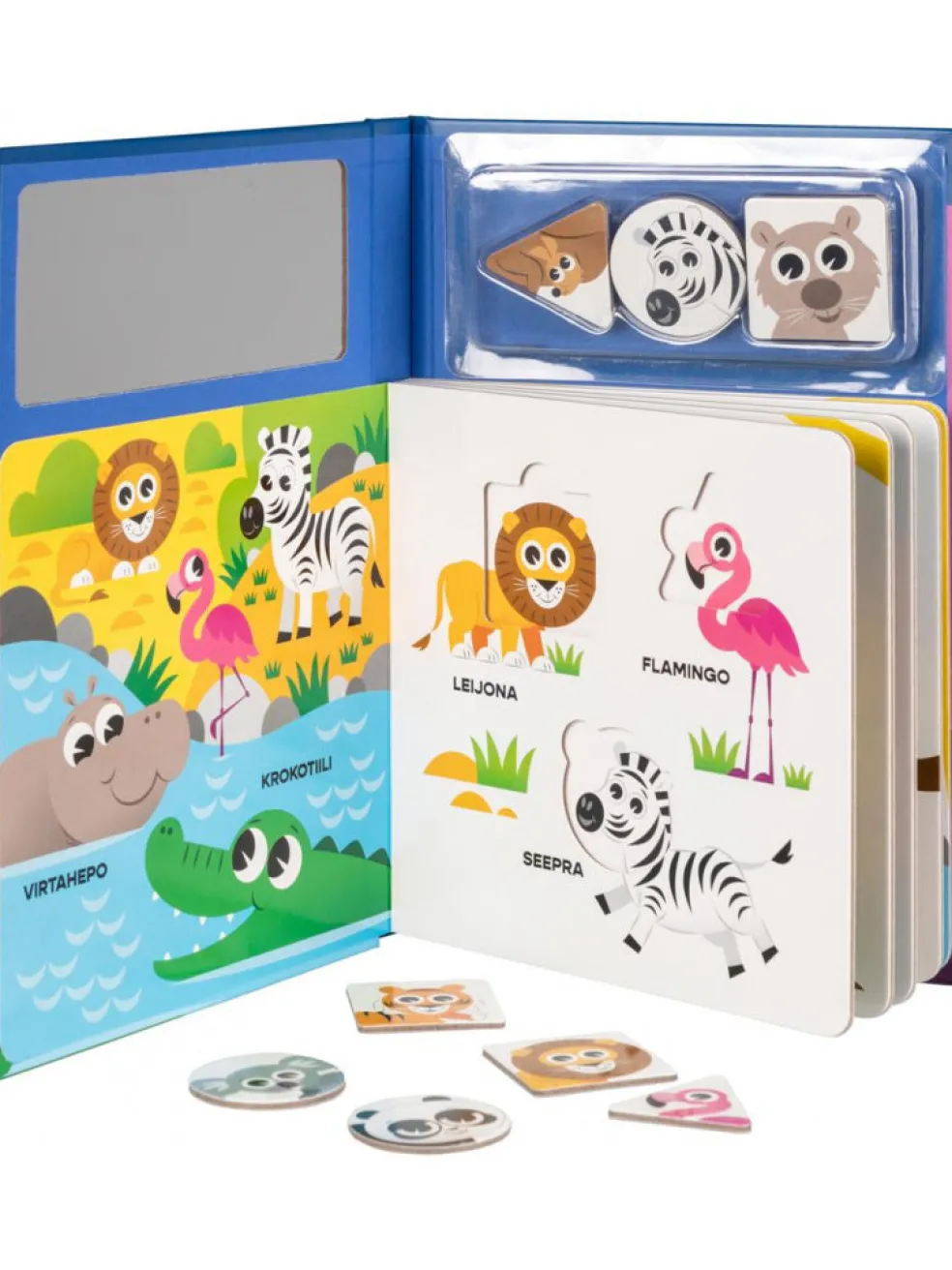 Veikeät eläimet tulevat tutuiksi tässä palapelikirjassa. Katso kuvasta mallia ja aseta erimuotoiset palat oikeille paikoilleen. Kokeile, miten hassuja nassuja syntyy palojen paikkaa vaihtamalla!