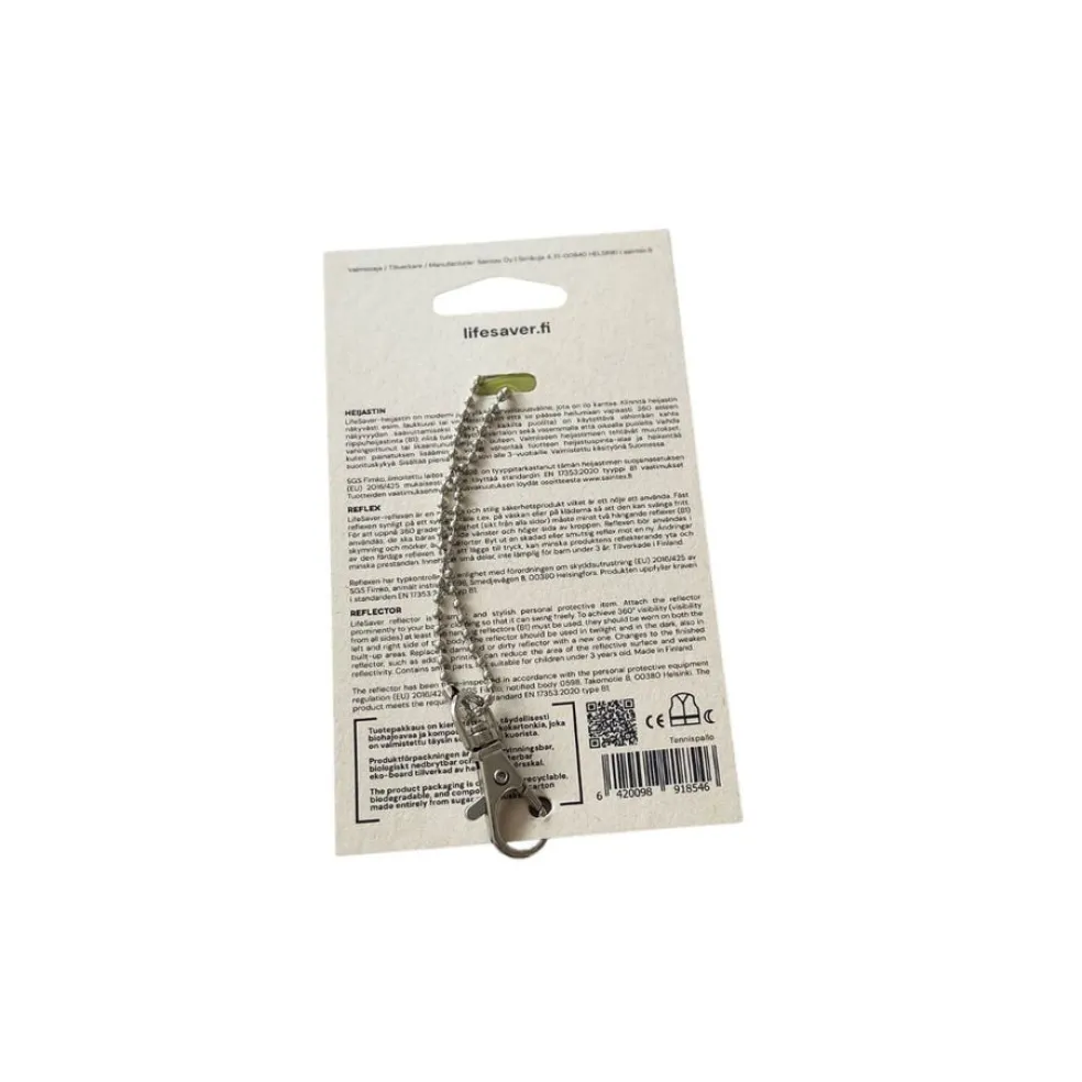 - Sisältö CE-hyväksytty heijastinkalvo (EN 17353:2020 jalankulkijaheijastin sertifioitu ja EN ISO 20471:2013 sertifioitu), CE-hyväksytty ftalaattivapaa muovi, kiinnikemateriaali kromattua metallia, tuotepakkaus kierrätettävää, biohajoavaa ja kompostoituvaa ekokartonkia.
