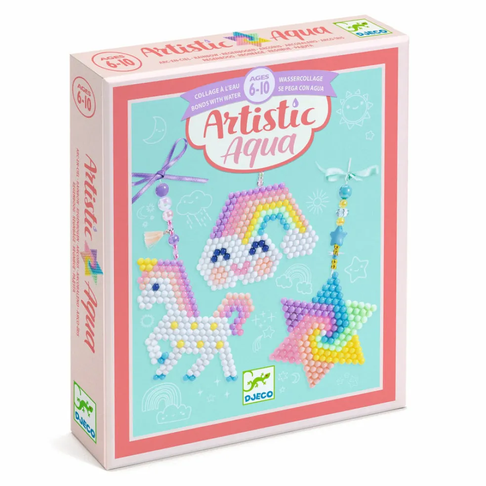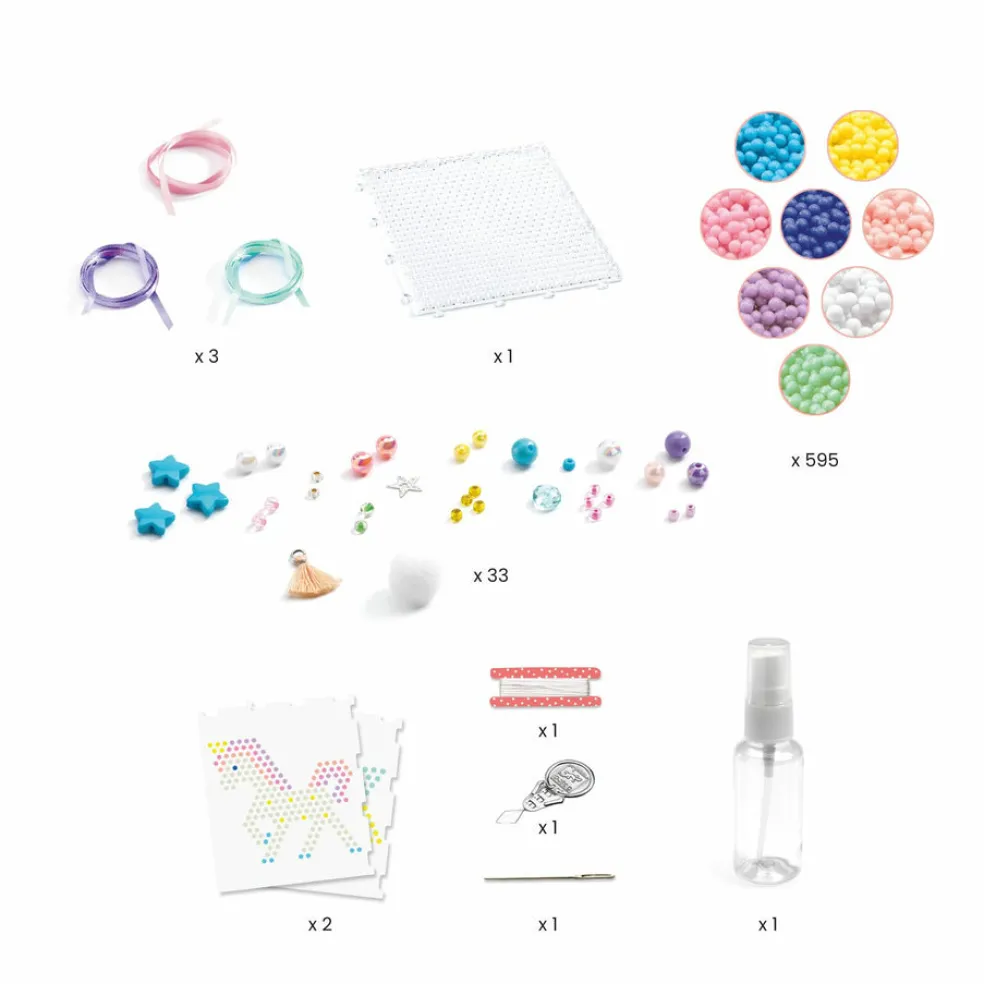 Paketissa on tarvikkeet 3 roikkuvaan koristeeseen, jotka tehdään vesihelmistä. Alustan päälle tehdään helmistä kuva, suihkutetaan kosteaksi ja kuin taikaa helmet tarttuvat toisiinsa työn kuivuttua. Lopuksi työt voi koristella ihanillakoristeilla ja nauhoilla!