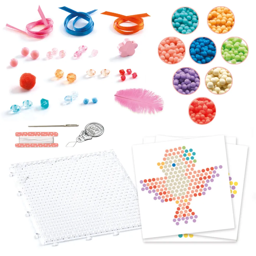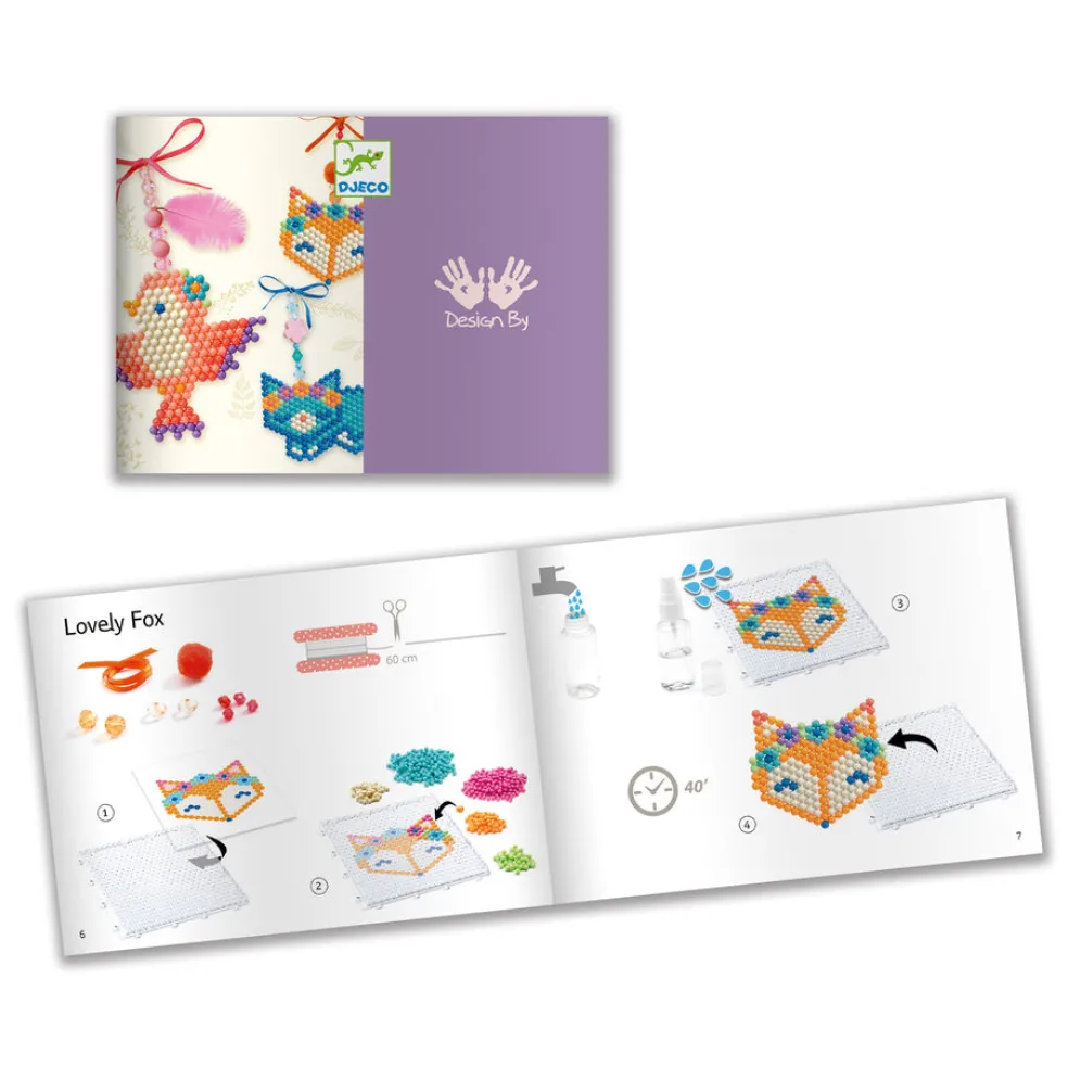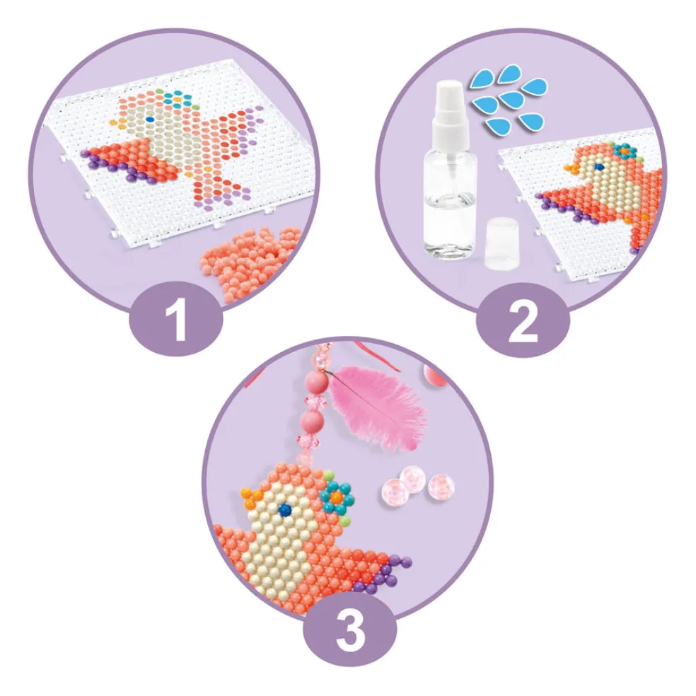 Paketissa on tarvikkeet 3 roikkuvaan koristeeseen, jotka tehdään vesihelmistä. Alustan päälle tehdään helmistä kuva, suihkutetaan kosteaksi ja kuin taikaa helmet tarttuvat toisiinsa työn kuivuttua. Lopuksi työt voi koristella ihanillakoristeilla ja nauhoilla!
