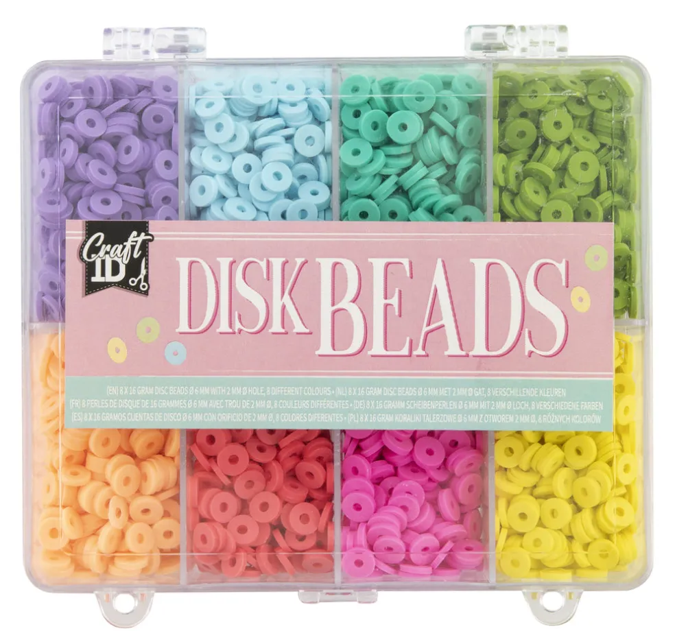 Suositut litteät helmet muovisessa säilytysrasiassa. 8 kirkasta väriä á 16 grammaa halkaisijaltaan 6mm litteitä helmiä