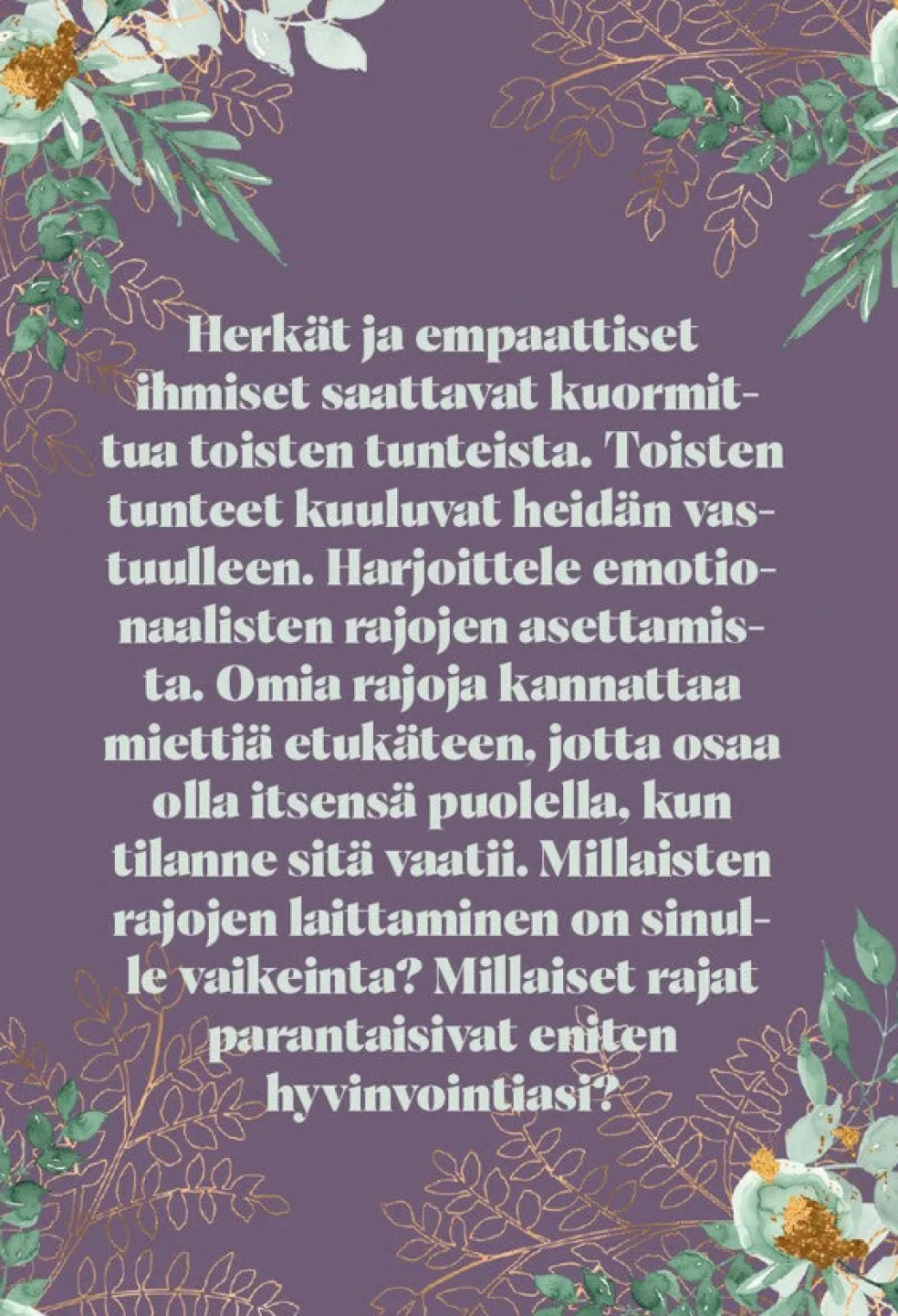 Nostettuasi kortin pysähdy hetkeksi ja pohdi tai kirjoita muistiin, mitä sen teksti herättää sinussa. Joskus oivallukset voivat herättää suuria tunteita. Jos näin käy, voit ottaa tunteen sallivasti vastaan ja kuulostella, mitä se haluaa sinulle kertoa.