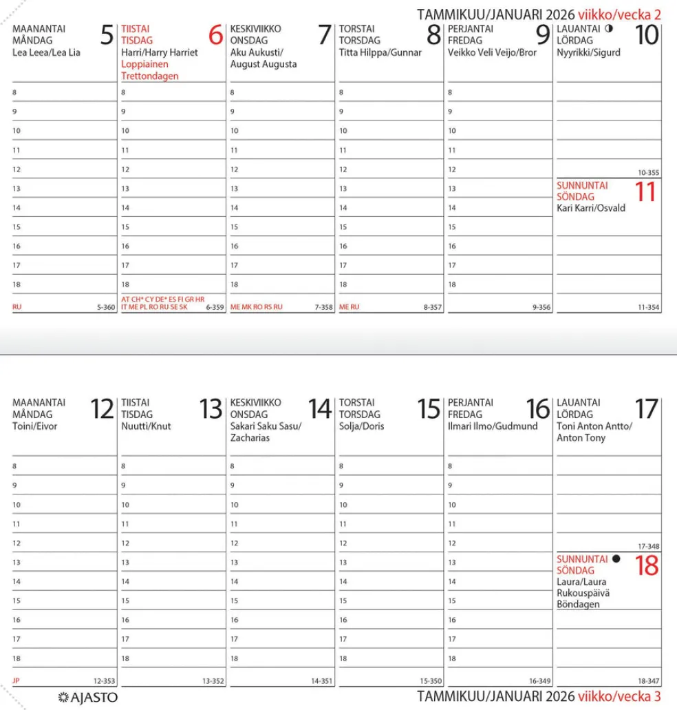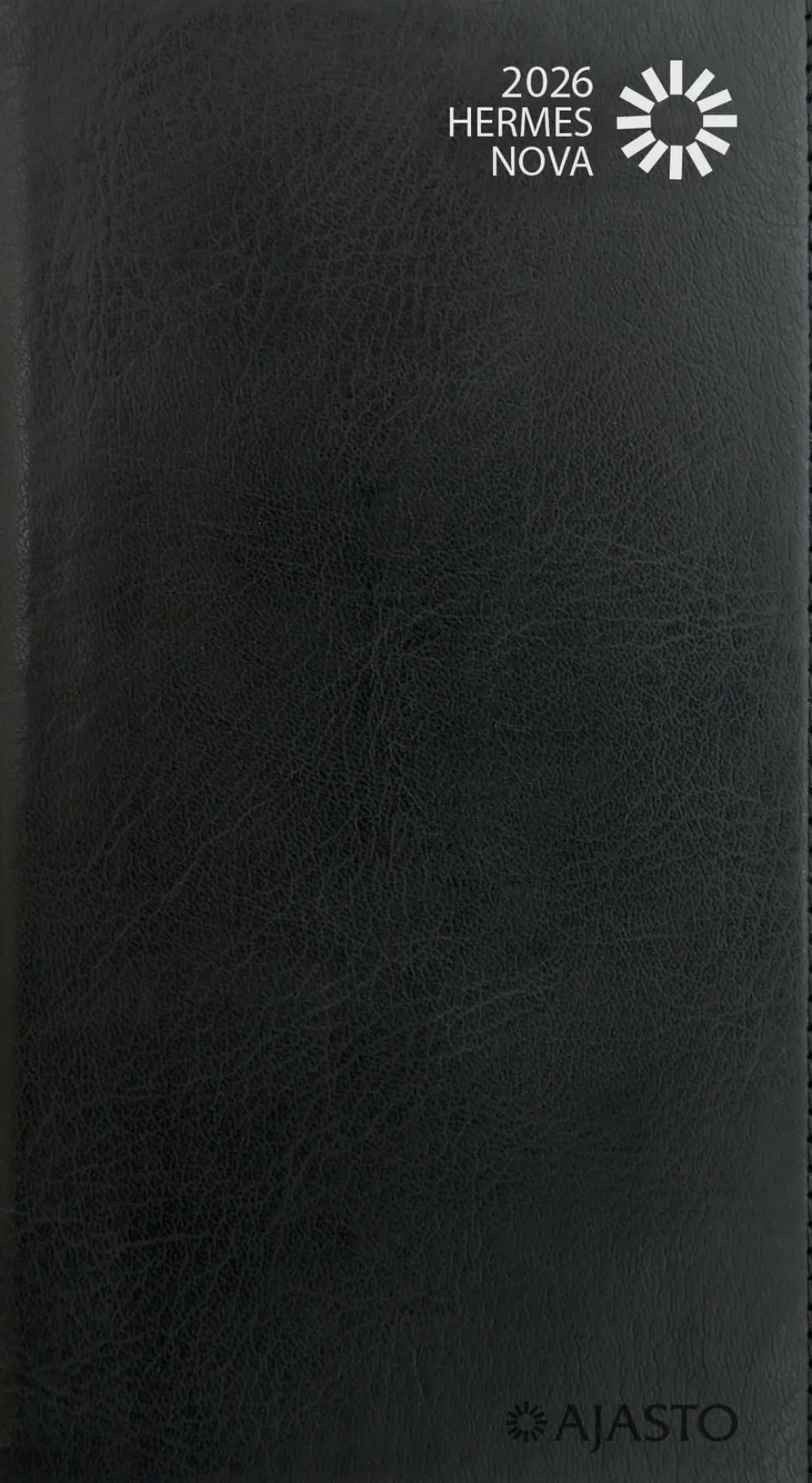 Koko 85 x 162 mm; leatherette-kannet; sidottu; kielisyys: suomi, ruotsi; kaksiviikkoinen kalenteriaukeama vaakana; päiväkirja 48/2025–6/2027; vuosisuunnitelmat 2026 ja 2027; liputuspäivät Suomessa; kansalliset vapaapäivät päiväkirjan sivuilla ja taulukkona; suomalaiset ja suomenruotsalaiset nimipäivät; välimatkataulukko; muistiinpanotilaa; FSC®-sertifioitu tuote.