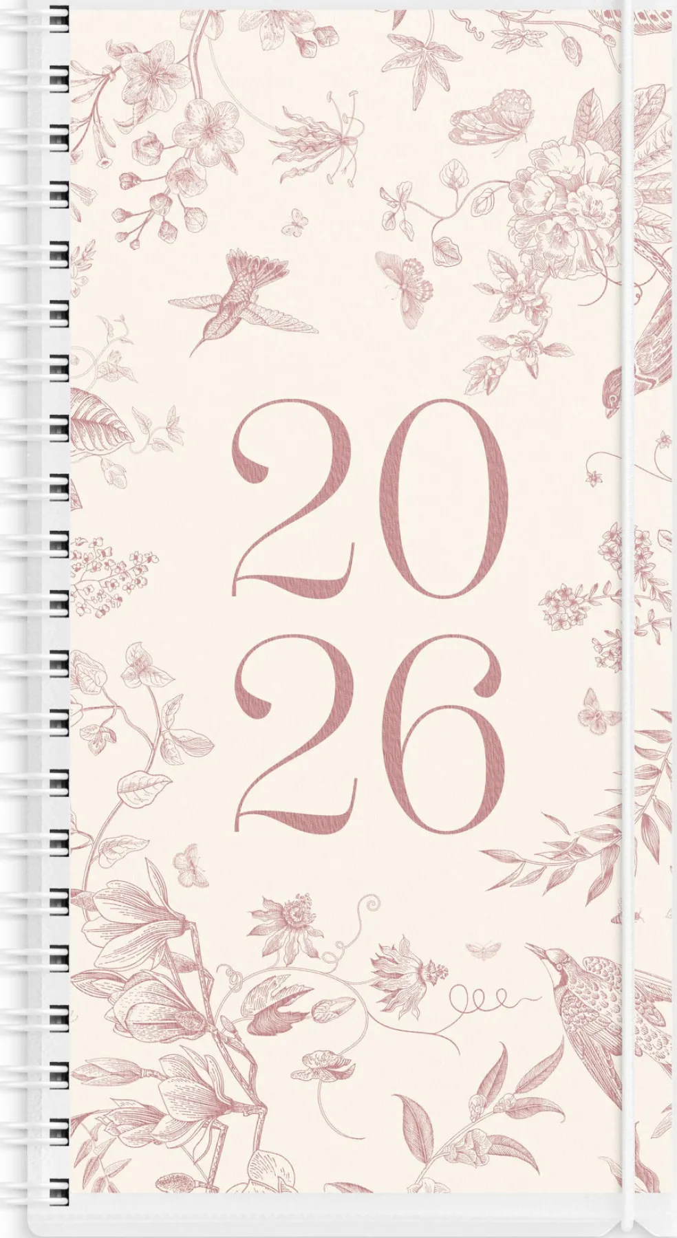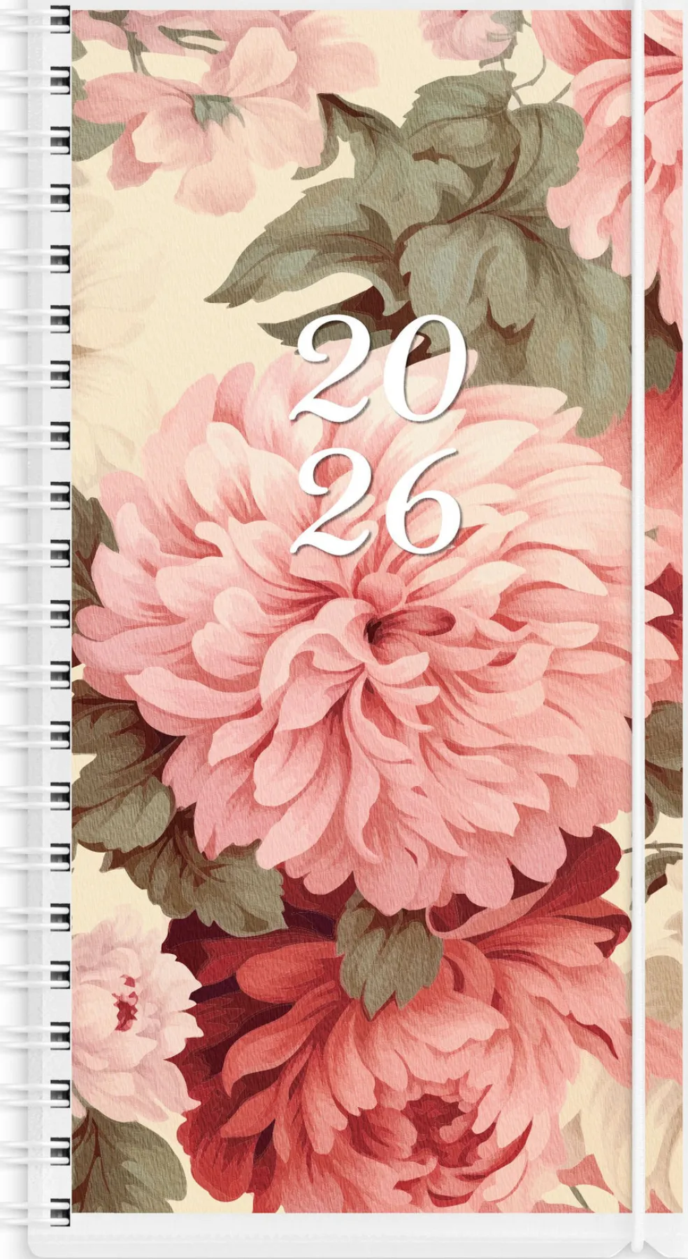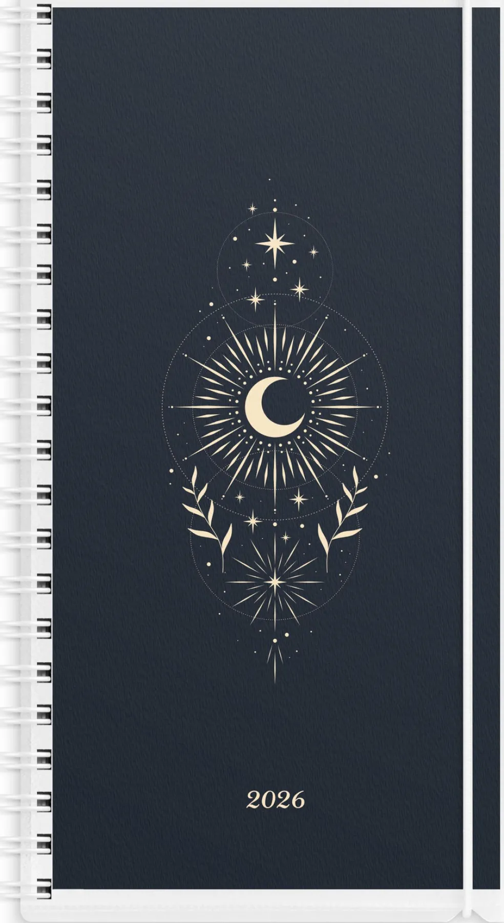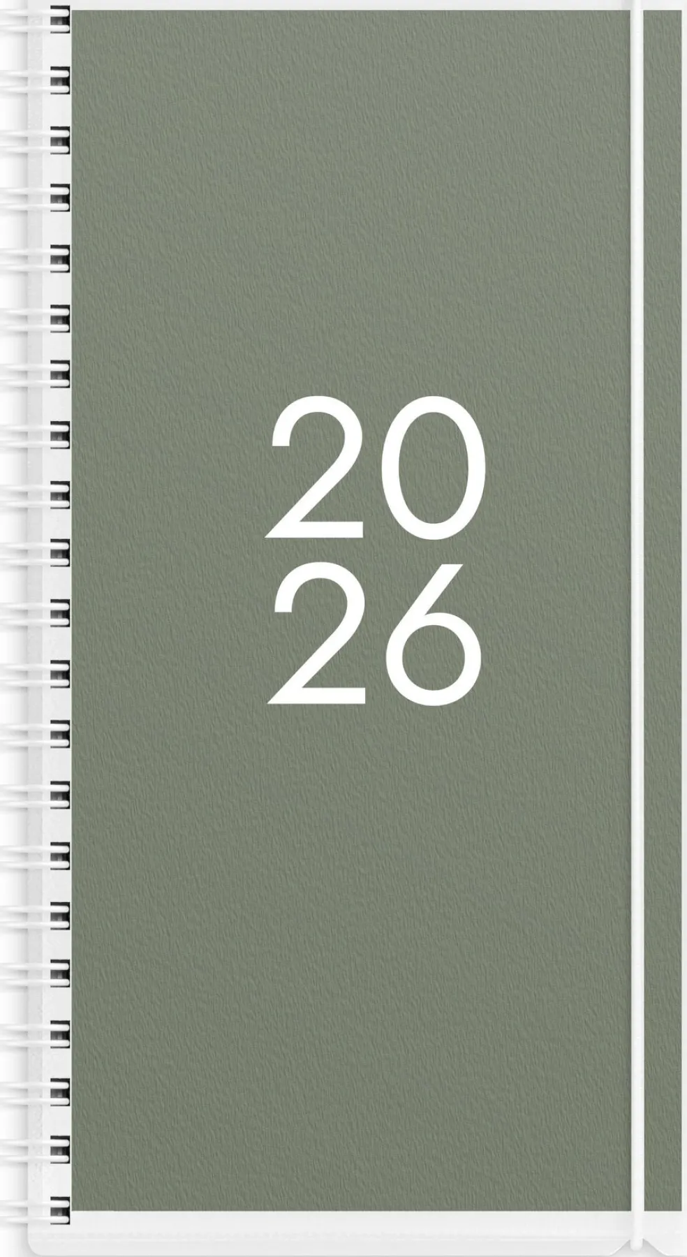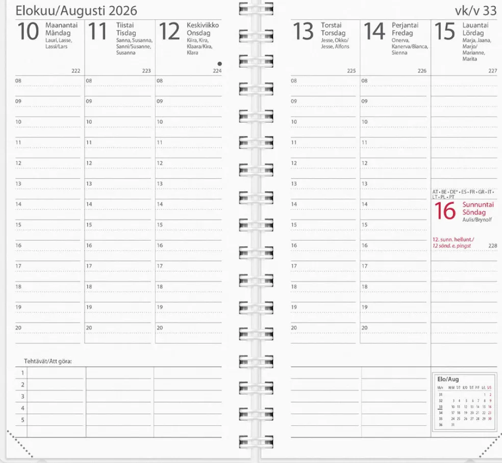 PP-kannen takana 4 aihetta muovitaskussa, kuminauhalla. Kalenterin aukeamalla yksi viikko ja kuluvan kuukauden kalenteritaulukko, tuntijaotus 08-20. Kalenteri sisältää nimipäivät, kansalliset pyhäpäivät, liputuspäivät, kuun vaiheet, vuosisuunnitelmat kuluvalle ja seuraavalle vuodelle, vuosiruudukot kuluvalle ja seuraavalle vuodelle, yleiset pyhäpäivät Euroopassa, kalendaariset tiedot, Suomen kartta ja välimatkataulukon. Kalenteriosa: vk 52 2025-vk 53 2026/2027. Kaksikielinen: suomi/ruotsi. Parikierresidottu. FSC®. Koko 83×158 mm.