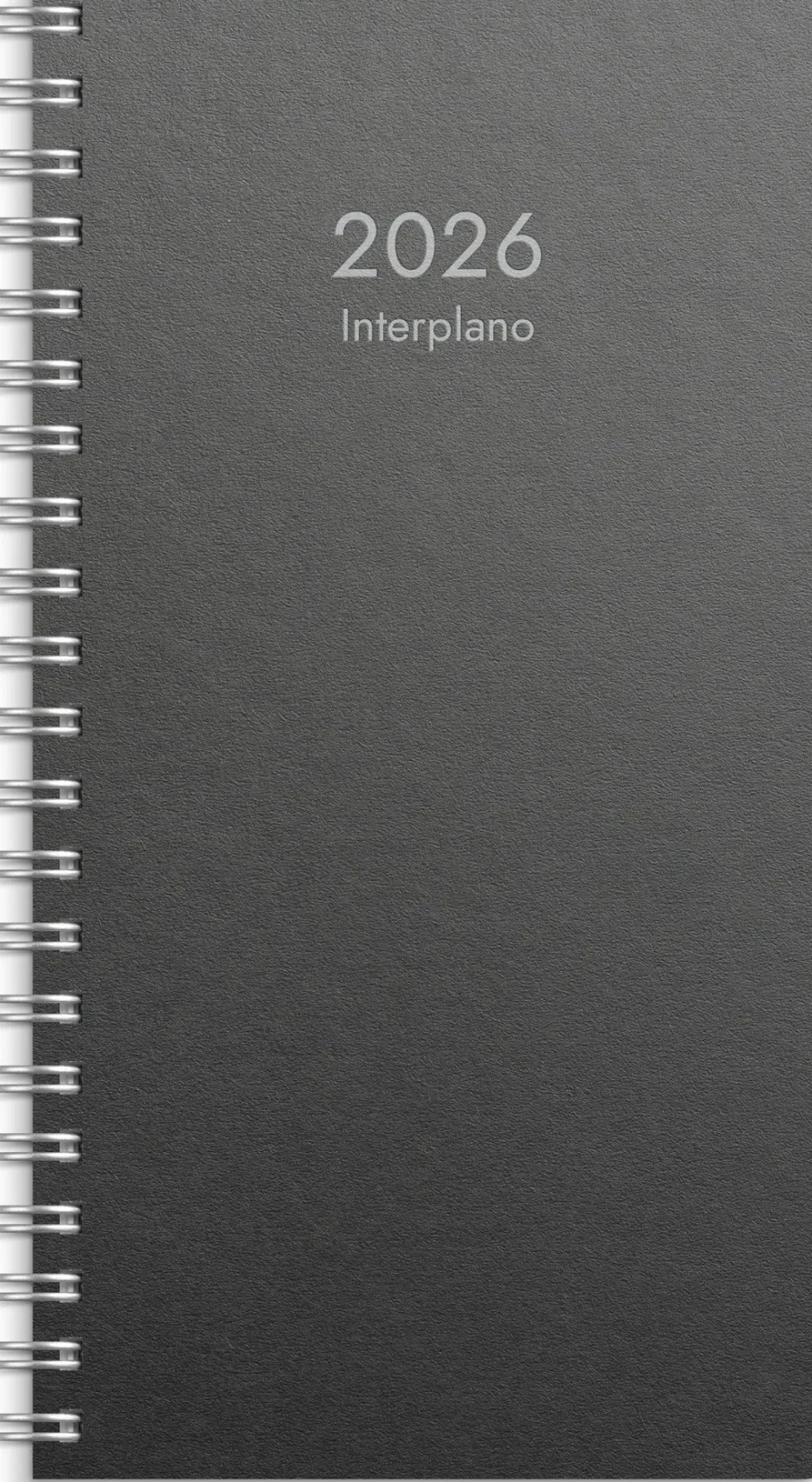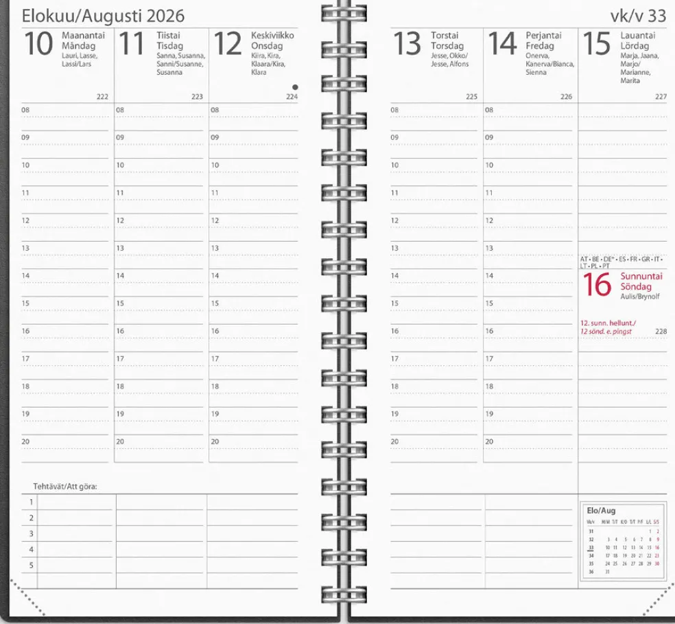 Musta ympäristöystävällinen uusiokartonkikansi. Kalenterin aukeamalla yksi viikko ja kuluvan kuukauden kalenteritaulukko, tuntijaotus 08-20. Kalenteri sisältää nimipäivät, kansalliset pyhäpäivät, liputuspäivät, kuun vaiheet, vuosisuunnitelmat kuluvalle ja seuraavalle vuodelle, vuosiruudukot kuluvalle ja seuraavalle vuodelle, yleiset pyhäpäivät Euroopassa, kalendaariset tiedot, Suomen kartta ja välimatkataulukon. Kalenteriosa: vk 52 2025-vk 53 2026/2027. Kaksikielinen: suomi/ruotsi. Parikierresidottu. FSC®. Koko 83×158 mm.