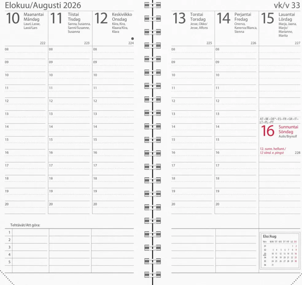 Kalenterin aukeamalla yksi viikko ja kuluvan kuukauden kalenteritaulukko, tuntijaotus 08-20. Kalenteri sisältää nimipäivät, kansalliset pyhäpäivät, liputuspäivät, kuun vaiheet, vuosisuunnitelmat kuluvalle ja seuraavalle vuodelle, vuosiruudukot kuluvalle ja seuraavalle vuodelle, yleiset pyhäpäivät Euroopassa, kalendaariset tiedot, Suomen kartta ja välimatkataulukon sekä erillisen muistilehtiön. Kalenteriosa: vk 52 2025-vk 53 2026/2027. Kaksikielinen: suomi/ruotsi. Parikierresidottu. FSC®. Koko 83×158 mm.