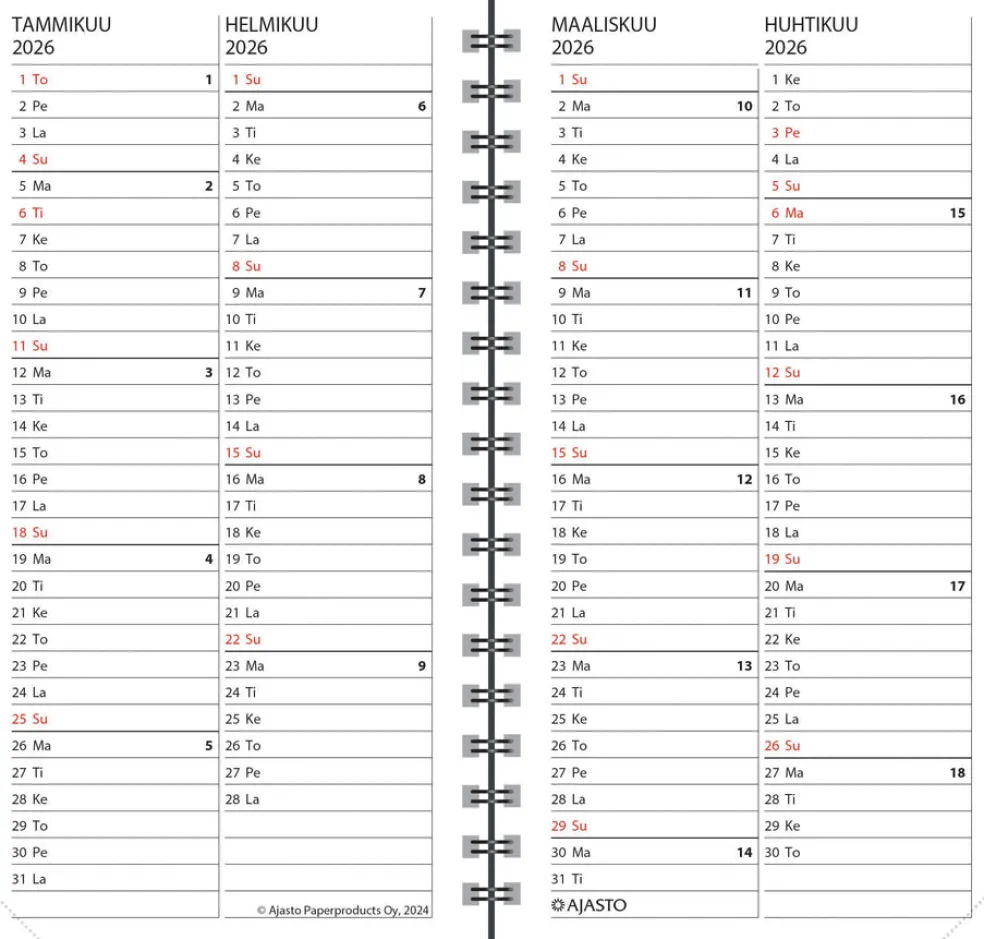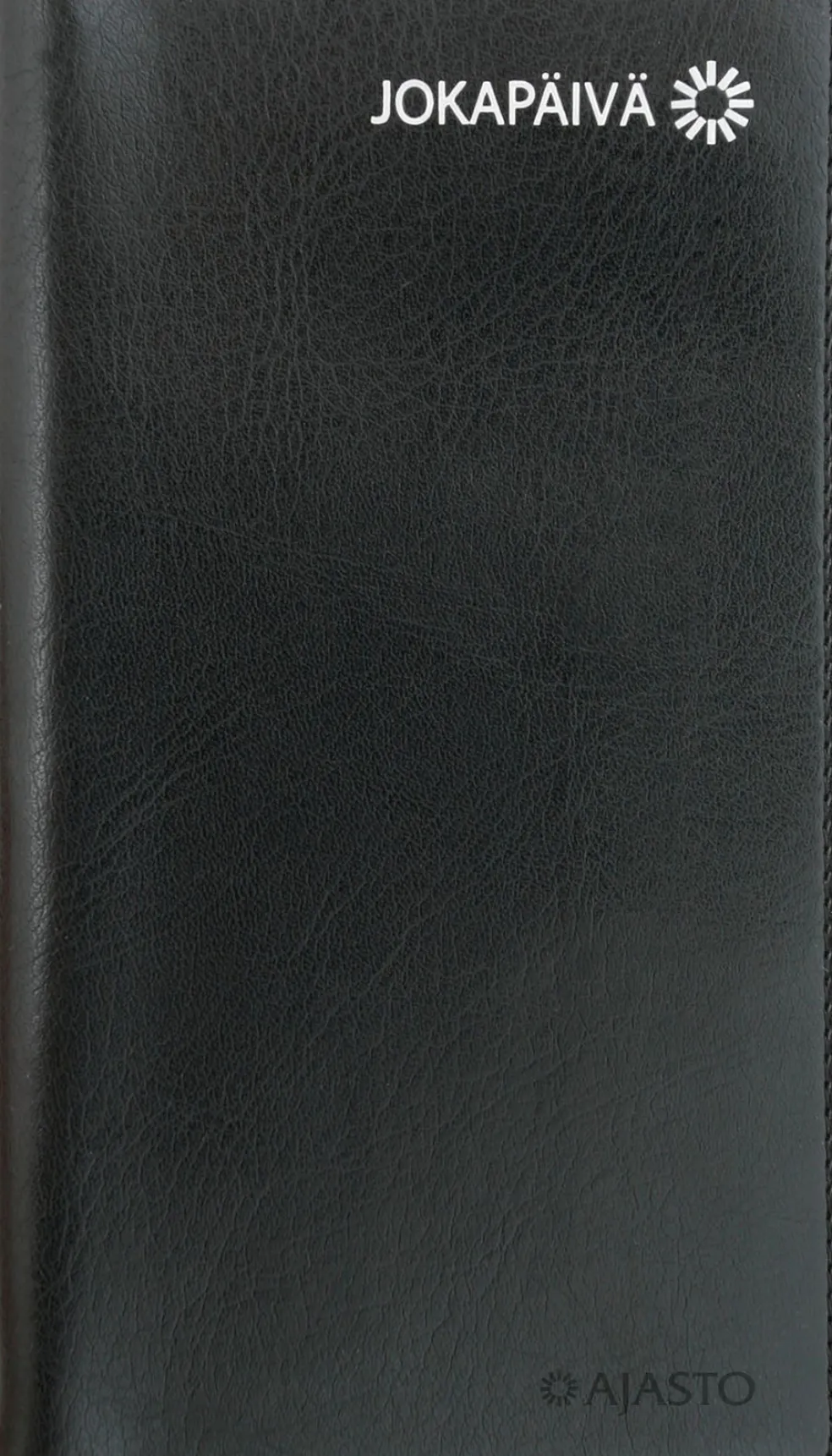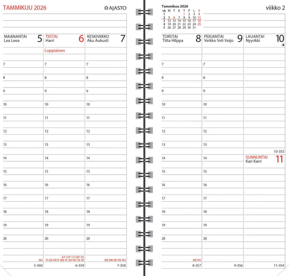 Koko 85 x 162 mm; leatherette-kannet; parikierresidottu; aukeamalla pystyviikko; päiväkirja 47/2025–2/2027; vuosisuunnitelmat 2026 ja 2027; liputuspäivät Suomessa; suomalaiset nimipäivät; kansalliset vapaapäivät; auringon nousu- ja laskuajat (Helsinki, Oulu); kuun- ja auringonpimennykset; tietoja Suomesta ja EU:sta; välimatkataulukko; kynänpidike; Avainlippu-tuote; FSC®-sertifioitu tuote.